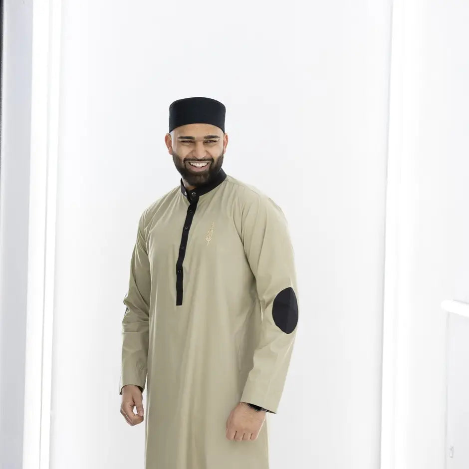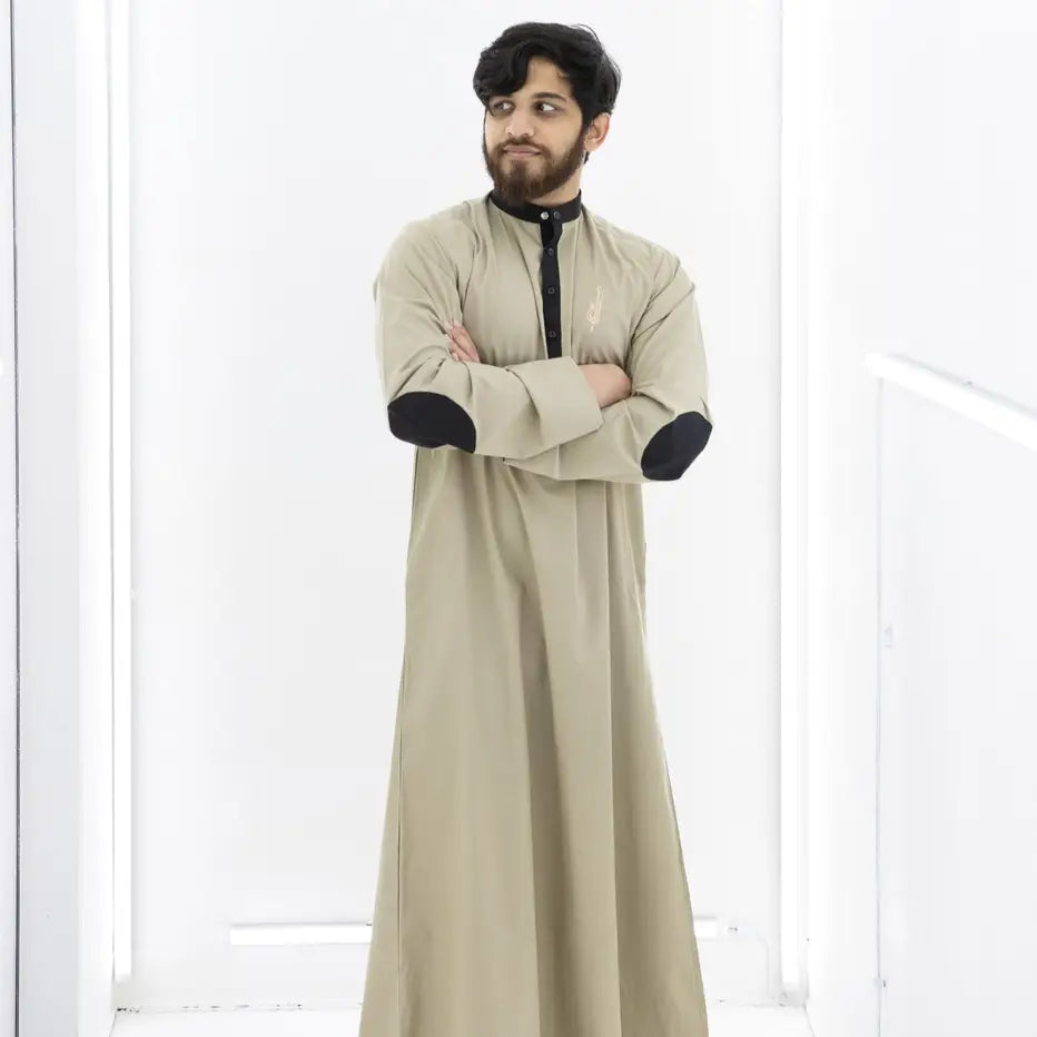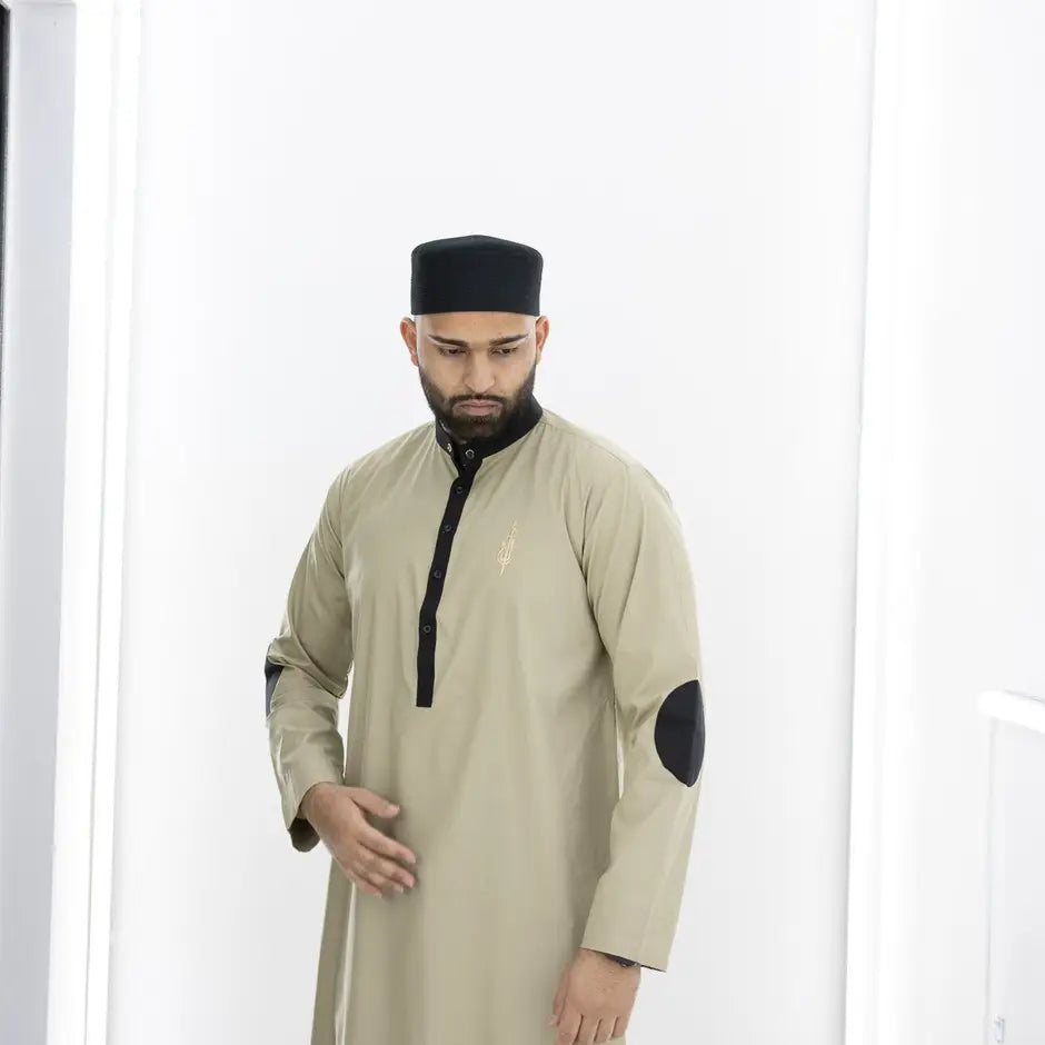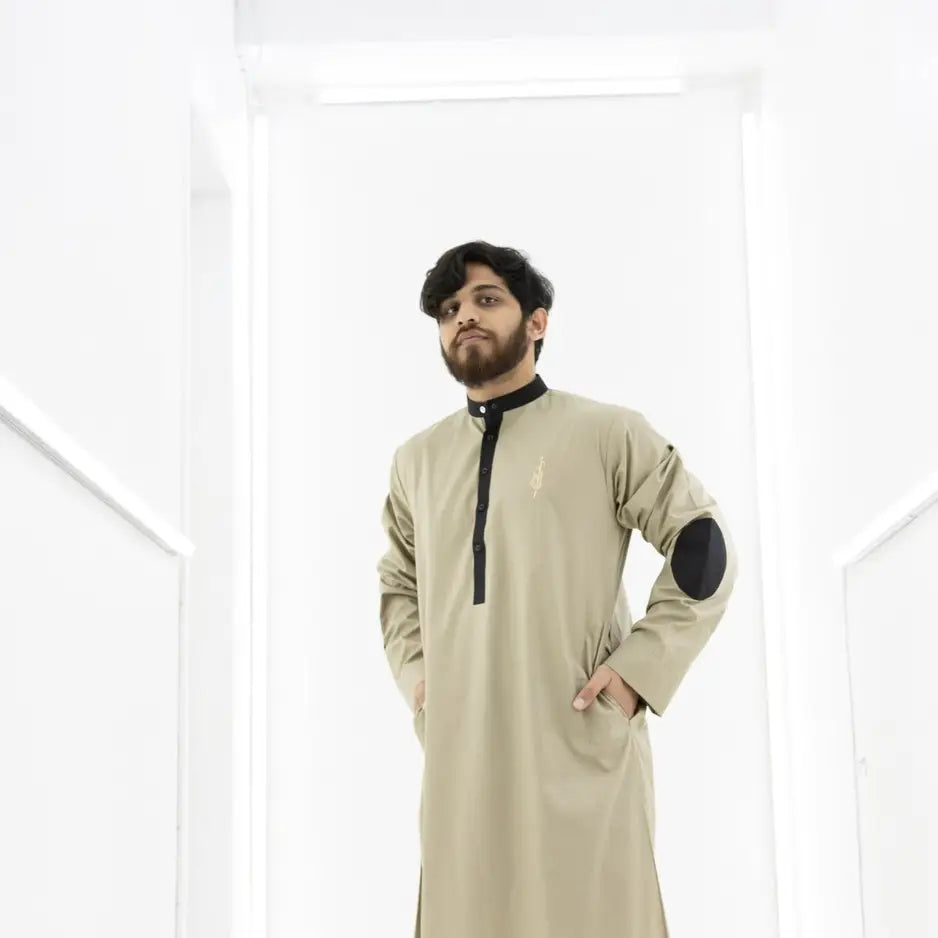Al Ameer signature thobes are not only stylish but also comfortable- the soft and smooth cotton feels great on your skin. Since thobes are ankle-length & one-piece, it fits the sunnah description of modest clothing for men. Al Ardh is in the color coffee and black. It includes pockets on both sides for convenience.