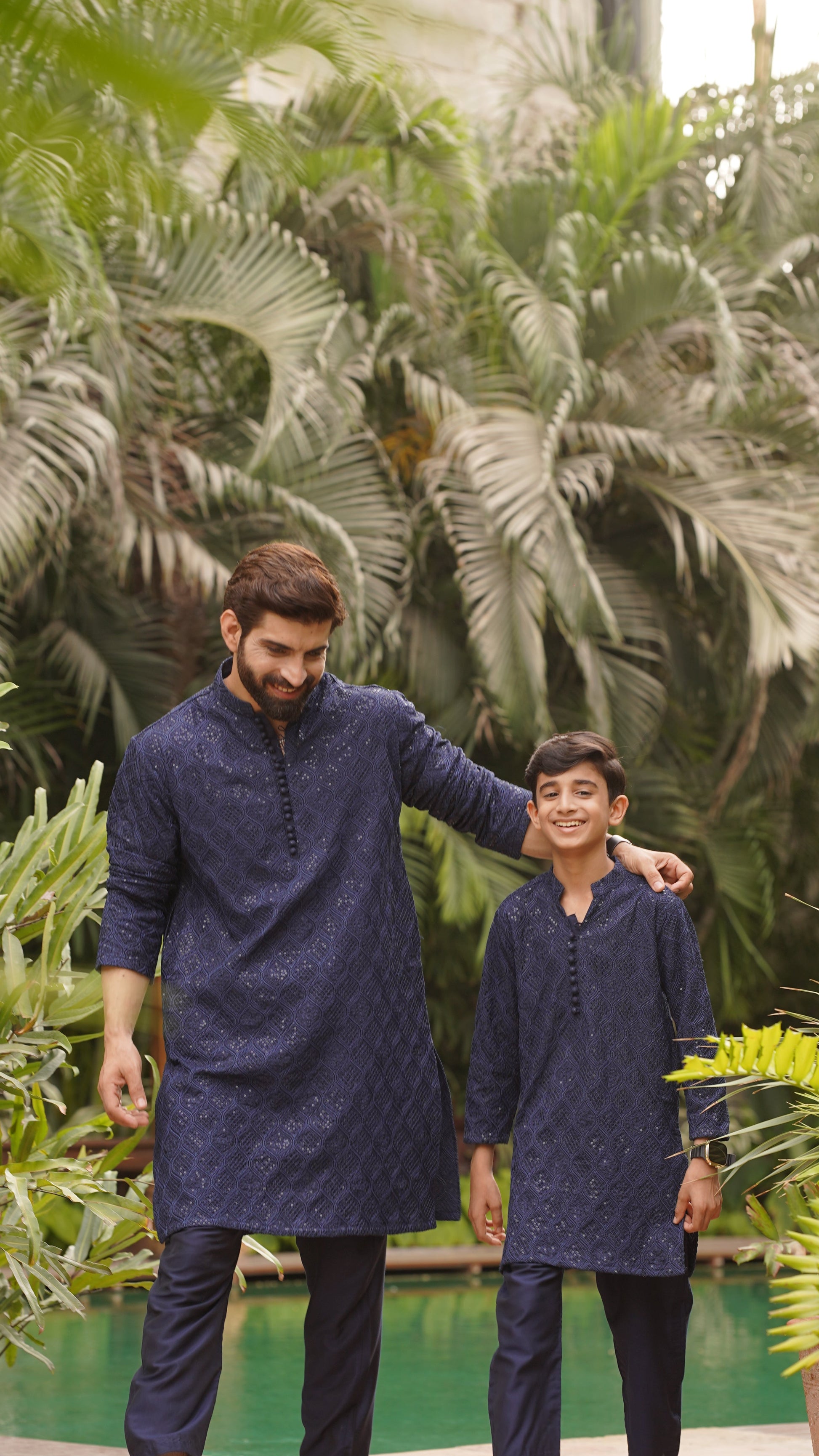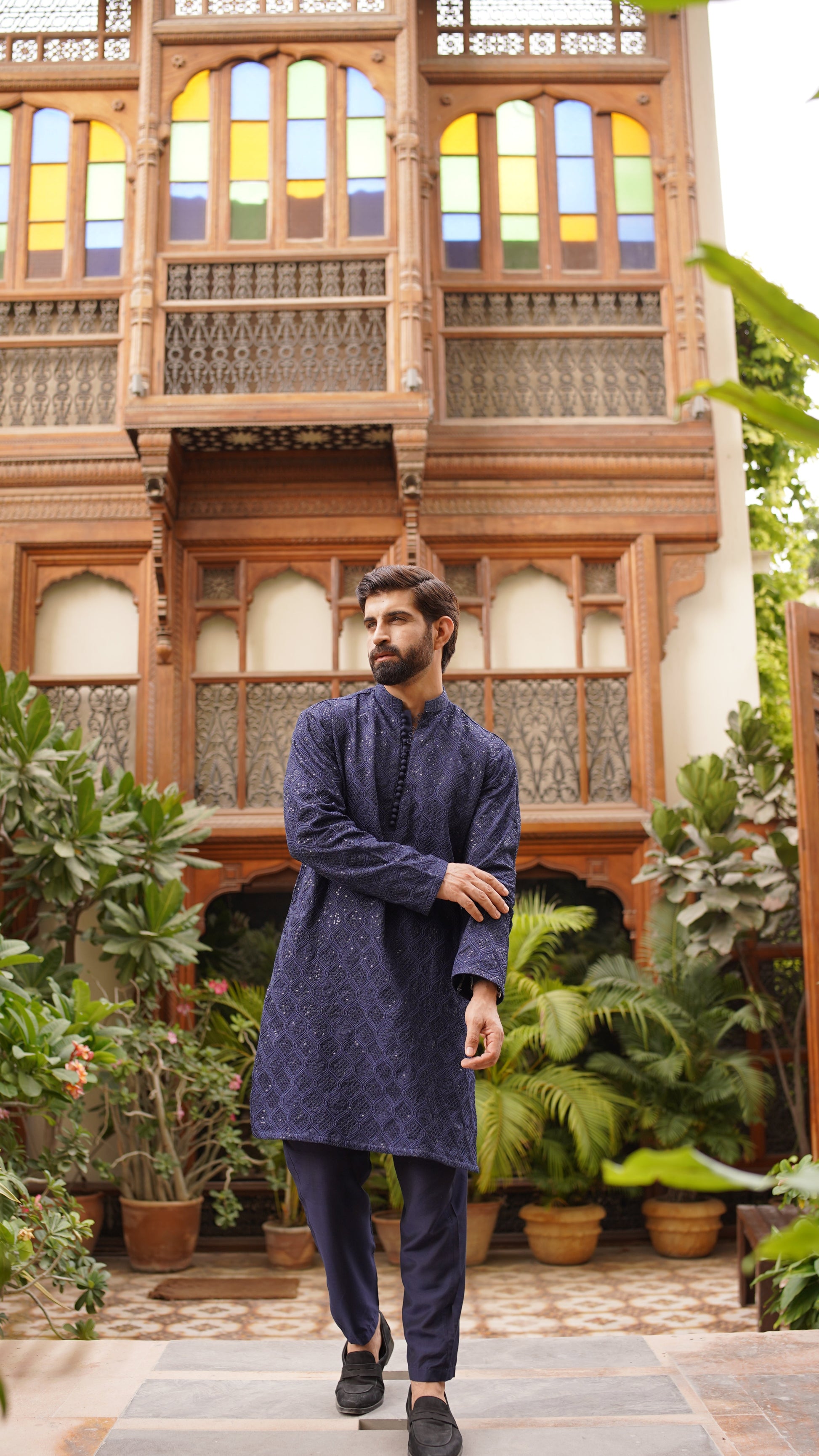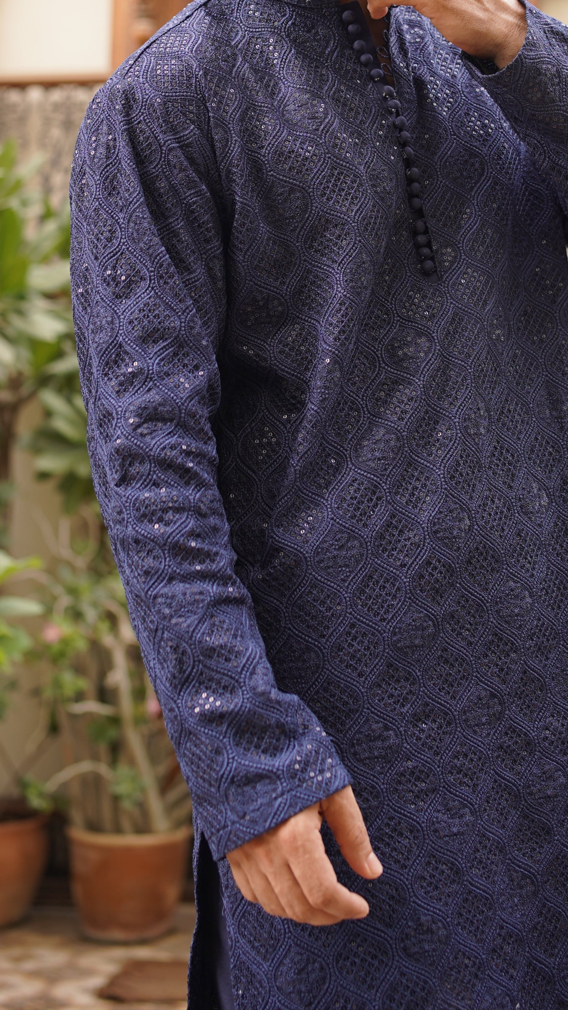 Embroidery all over with water sequins, sequin color is Black, ball buttons, Blue pajama, Kurta color is Deep Blue