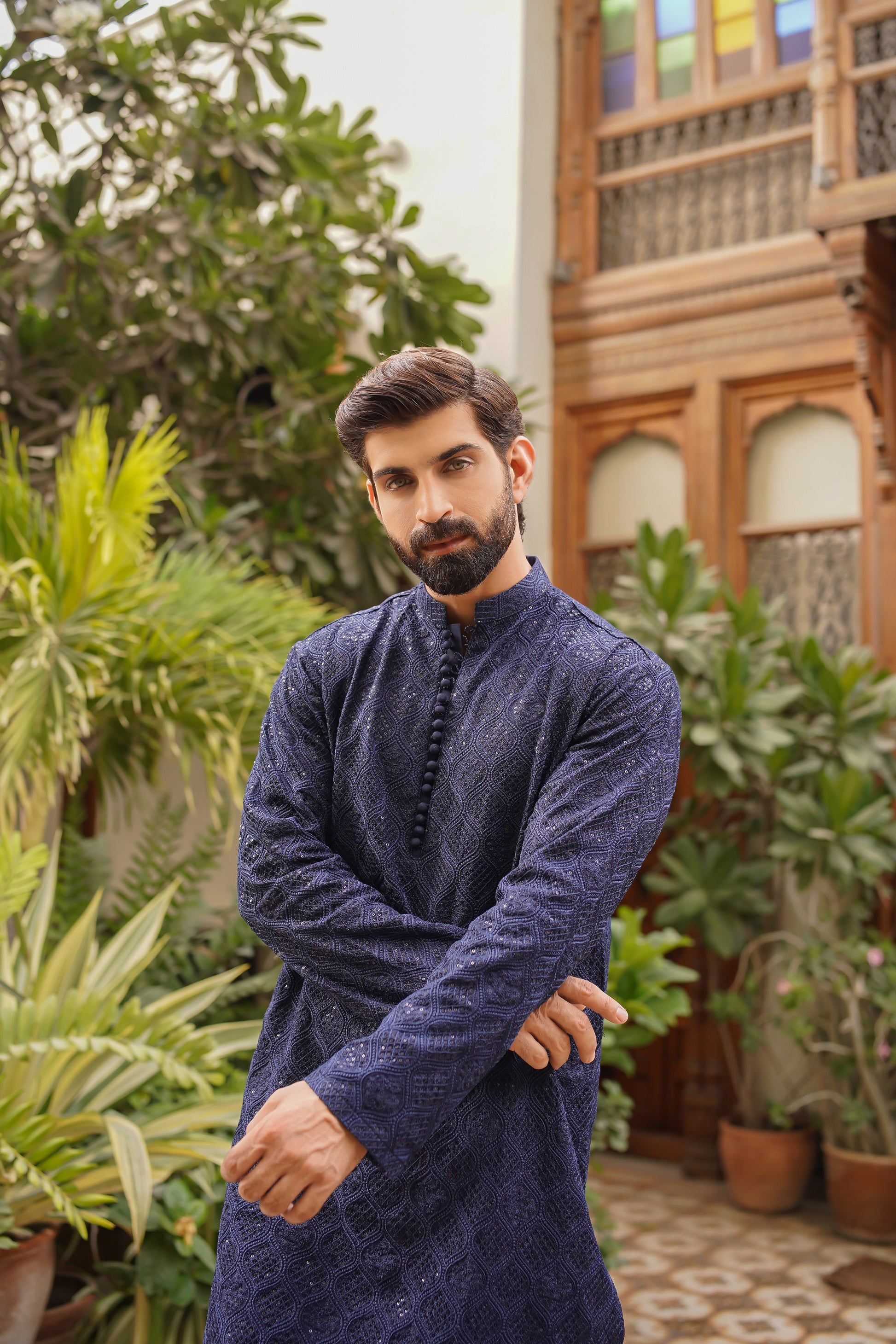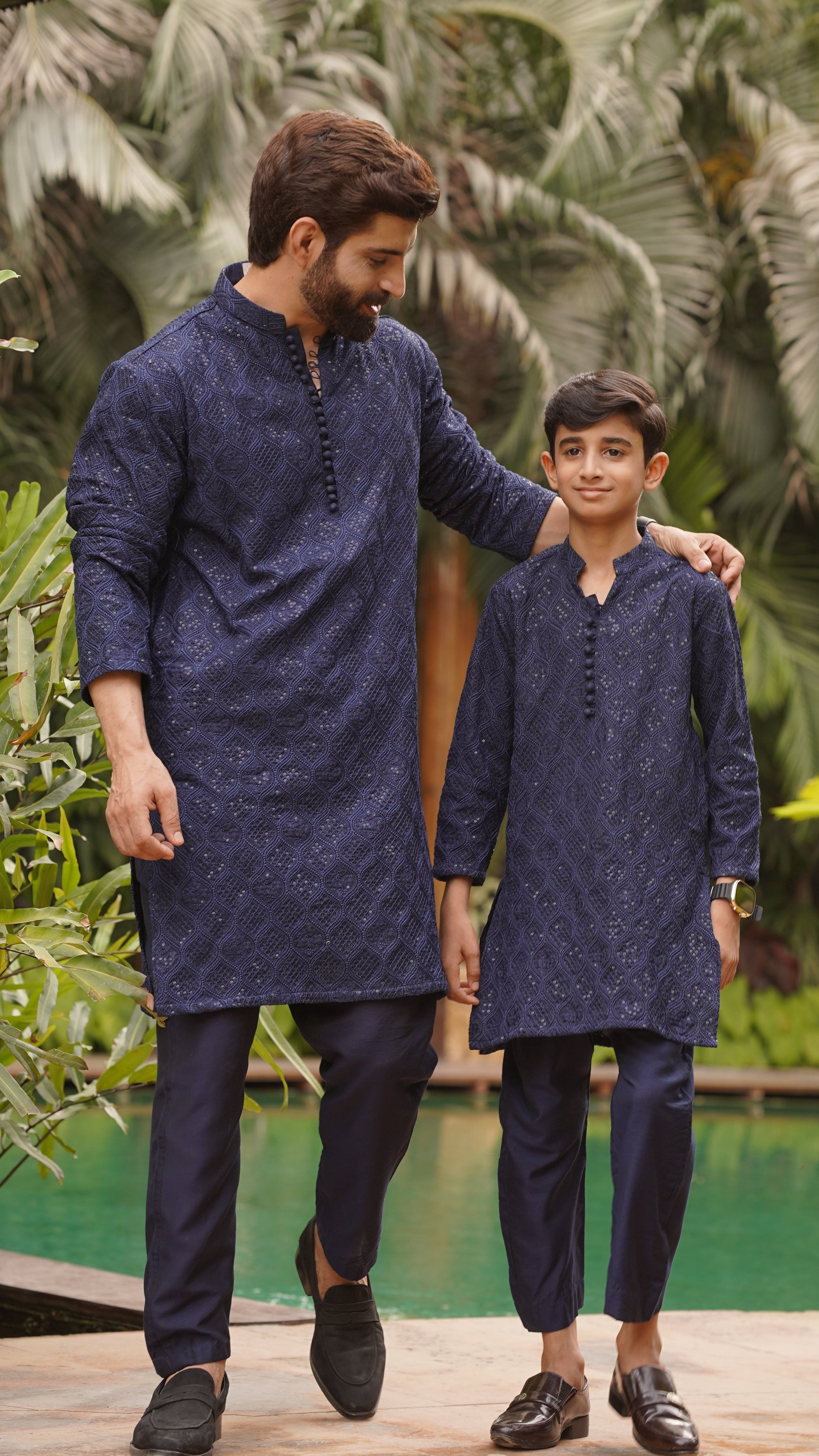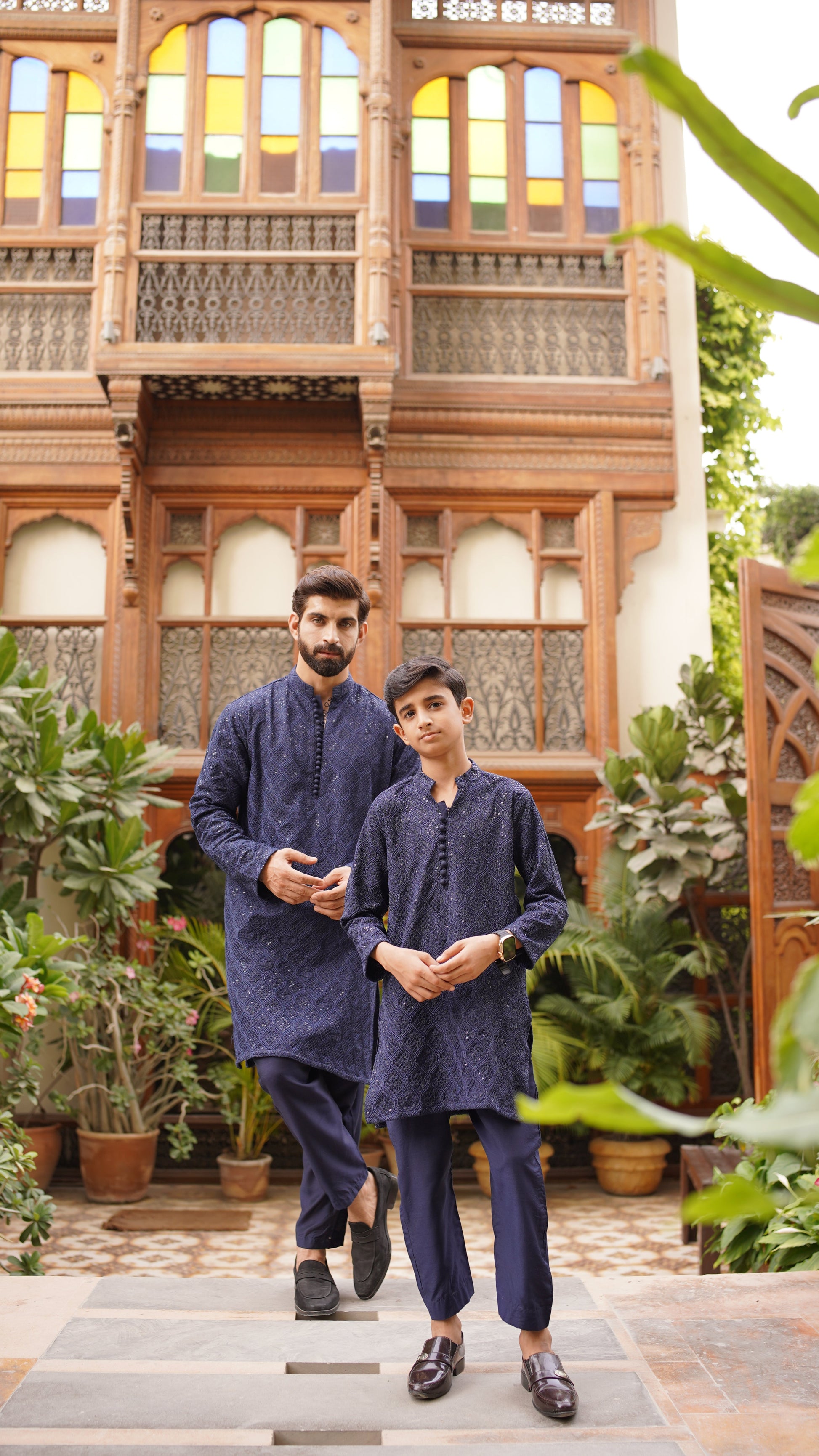 Embroidery all over with water sequins, sequin color is Black, ball buttons, Blue pajama, Kurta color is Deep Blue