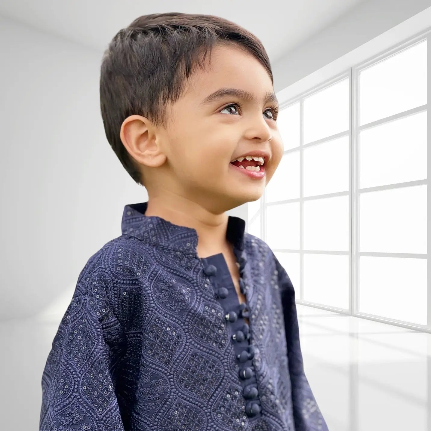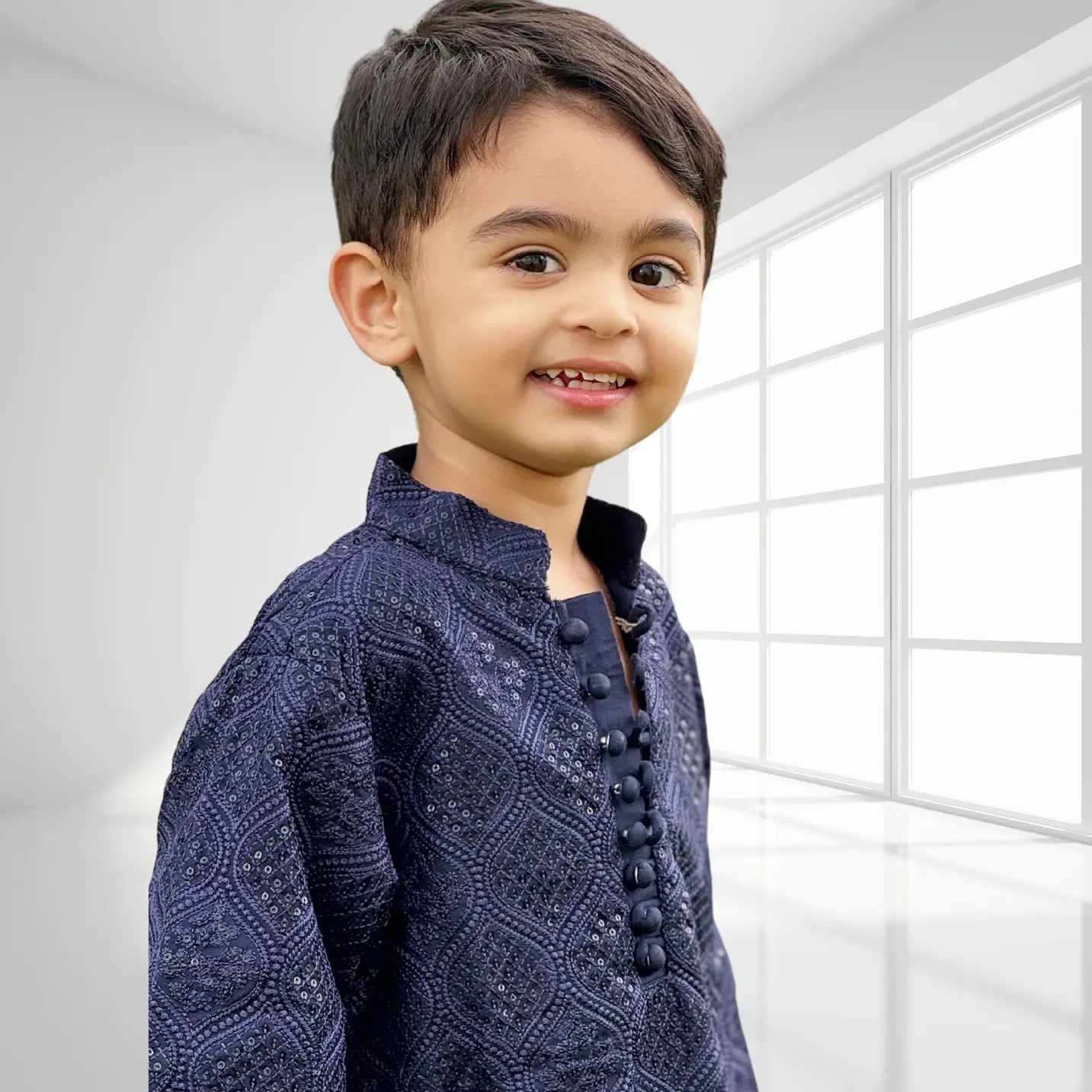 Embroidery all over with water sequins, sequin color is Black, ball buttons, Blue pajama, Kurta color is Deep Blue