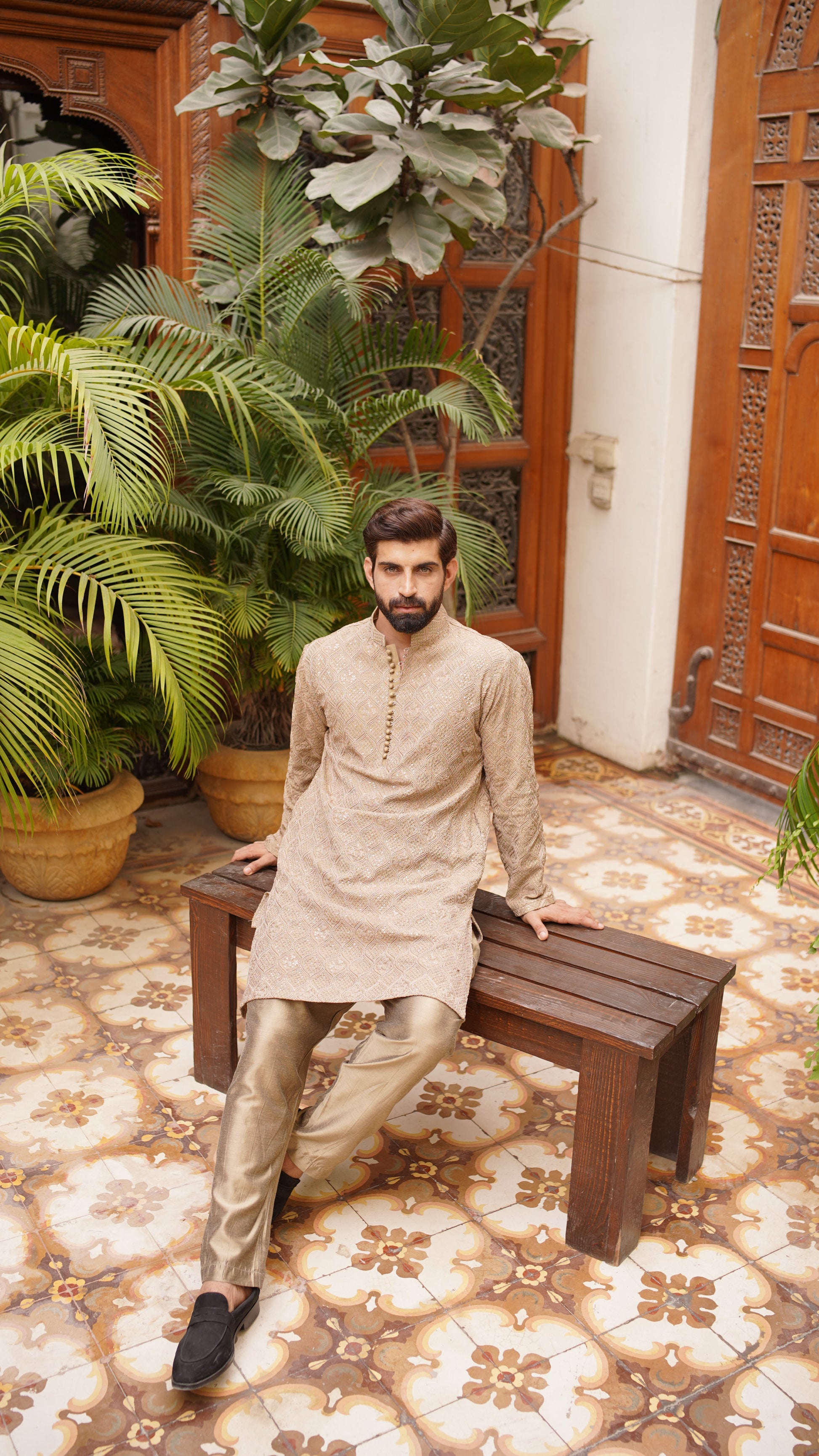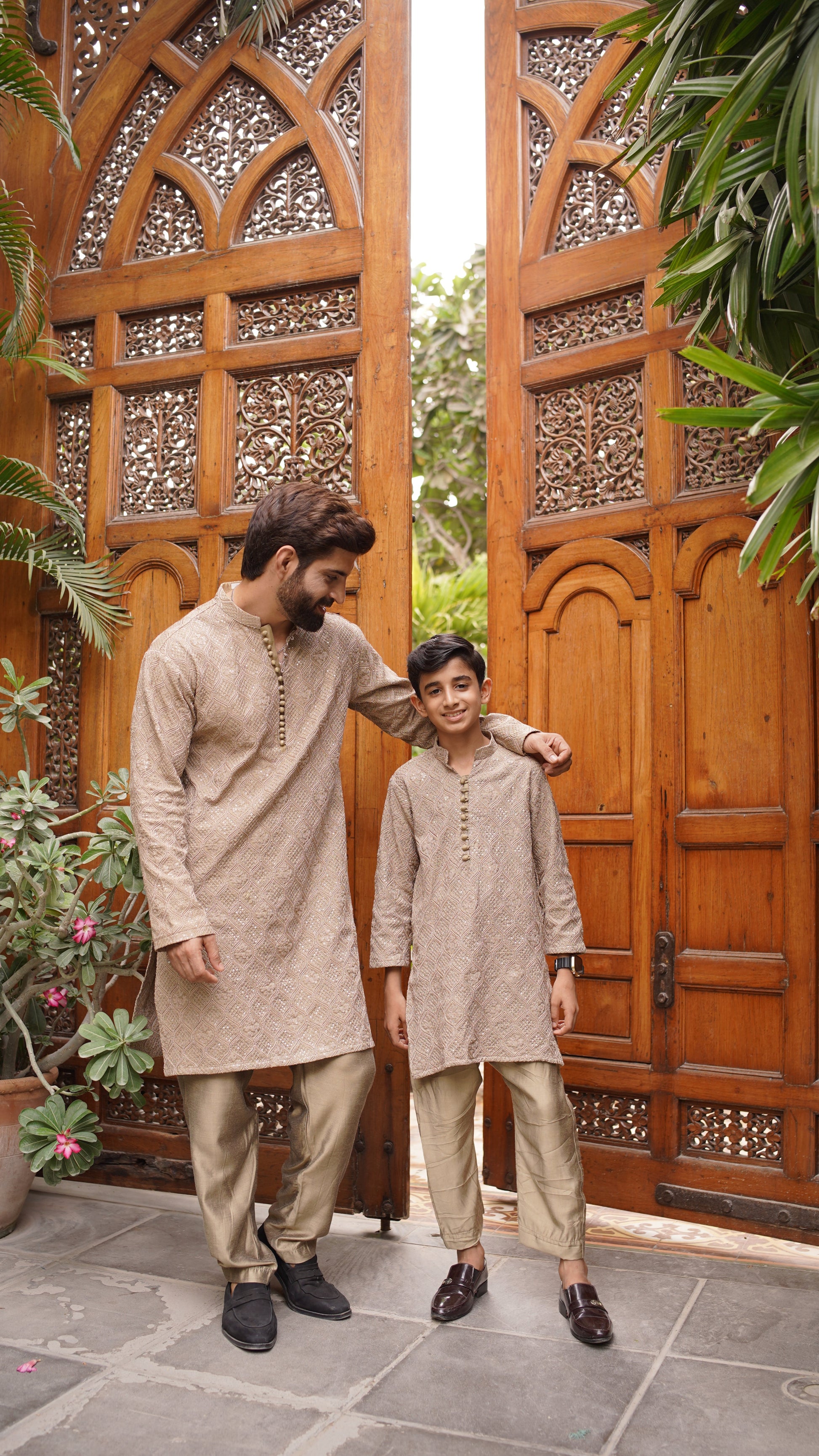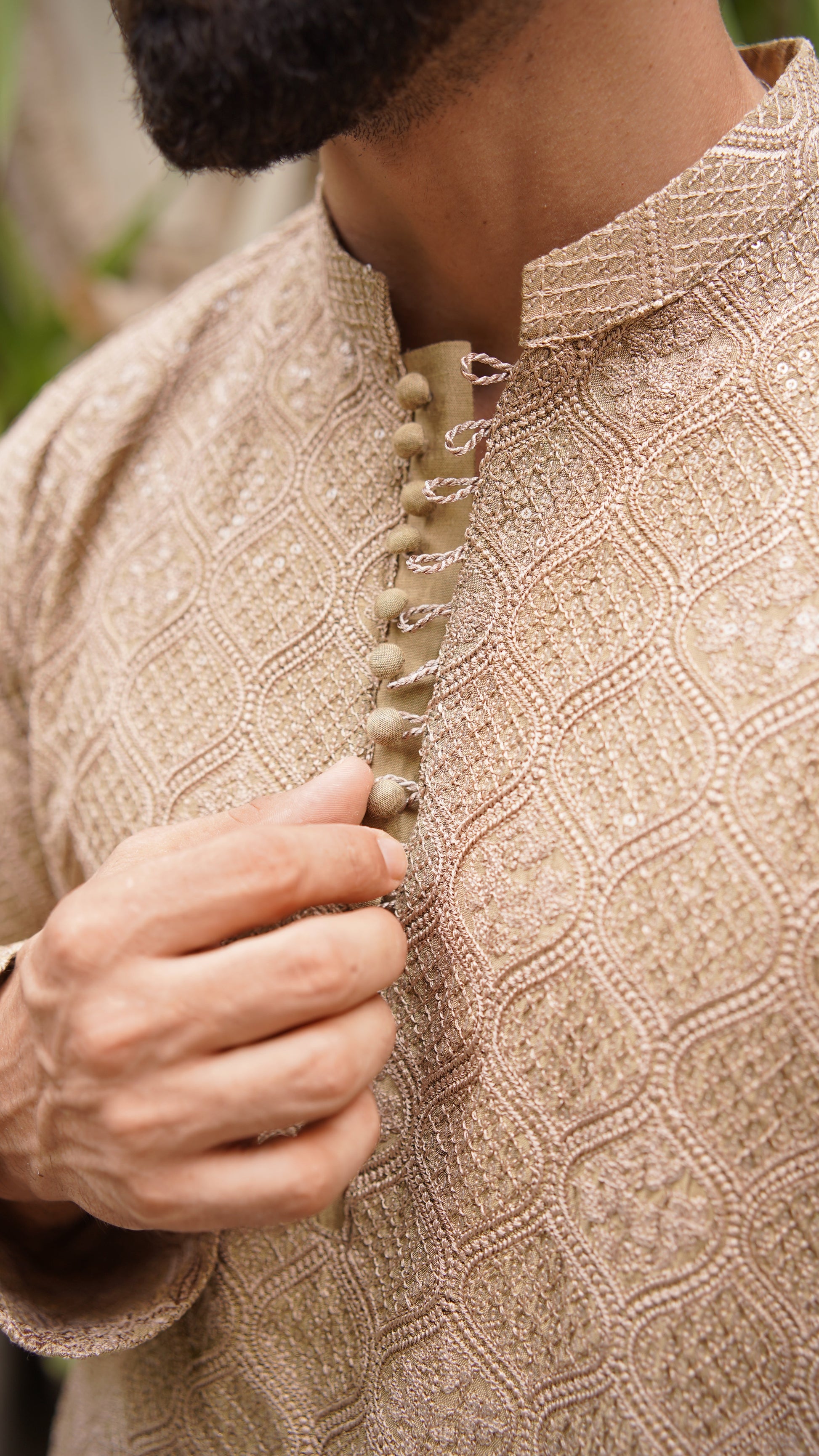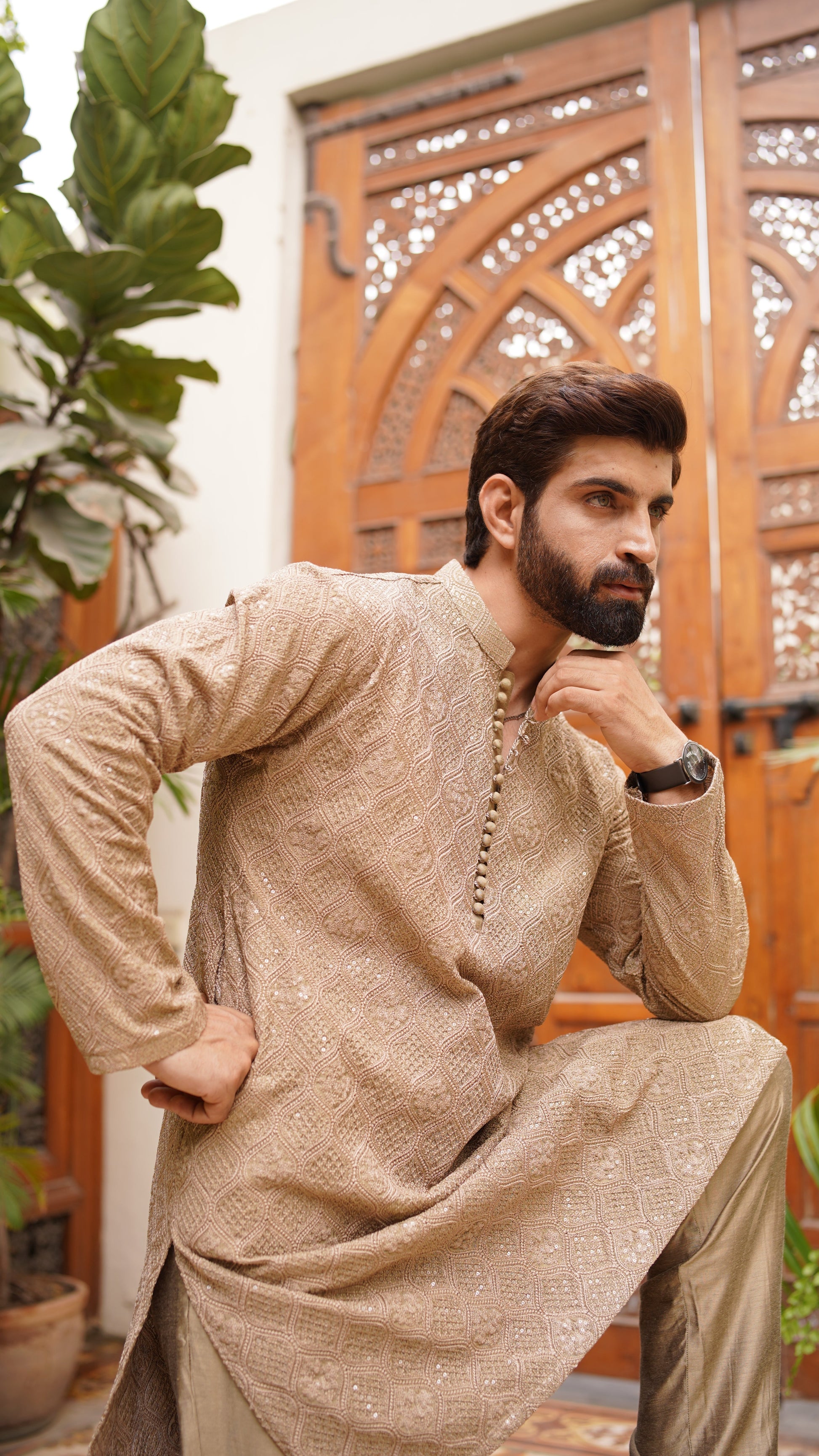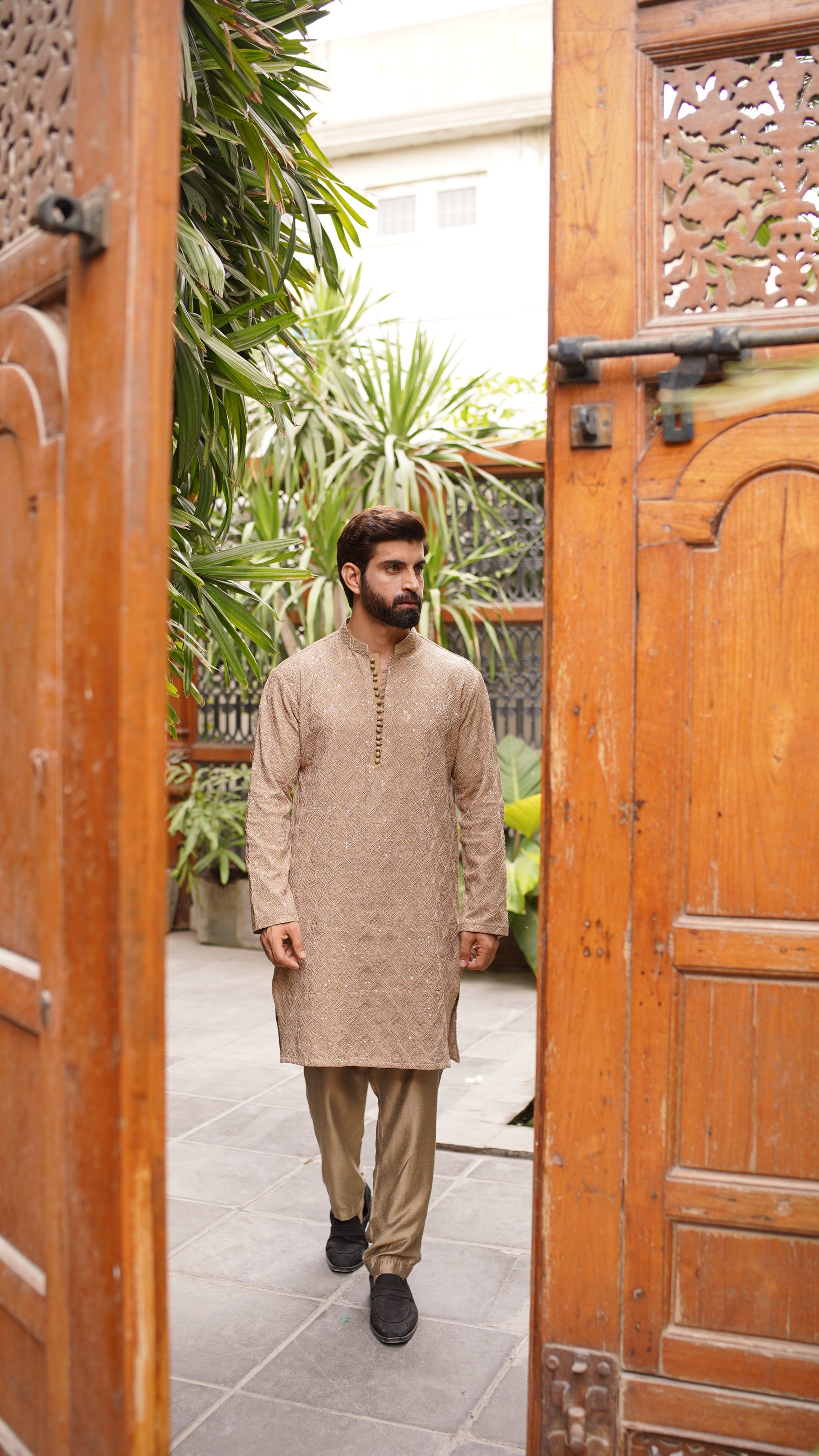 Embroidery all over with water sequins, ball buttons, Brown Pajama, Kurta color is Caramel Brown