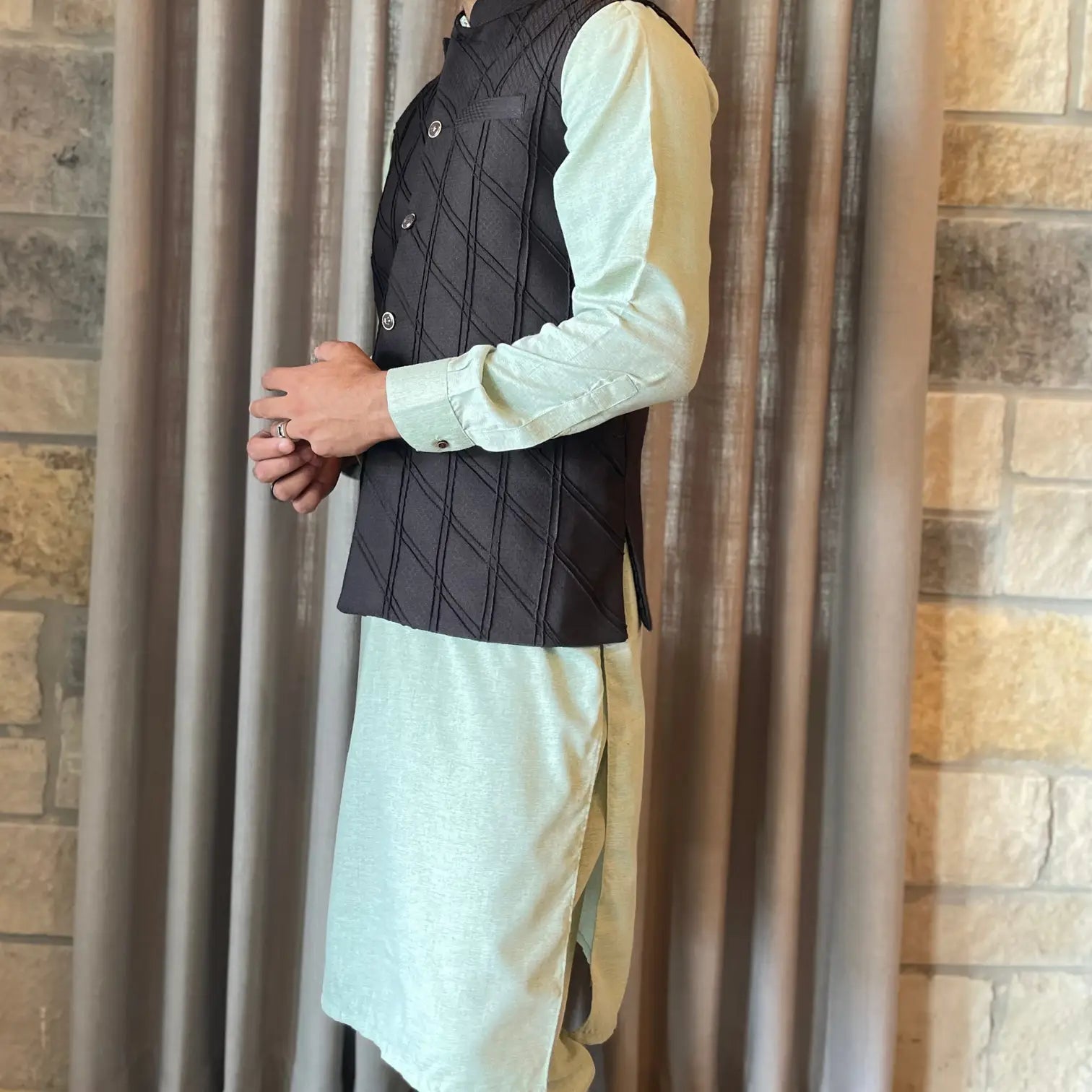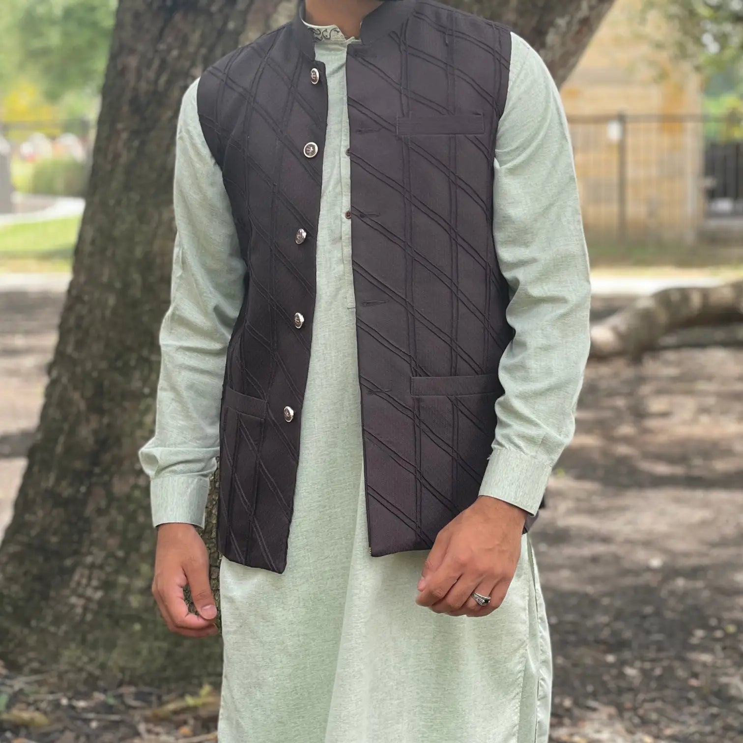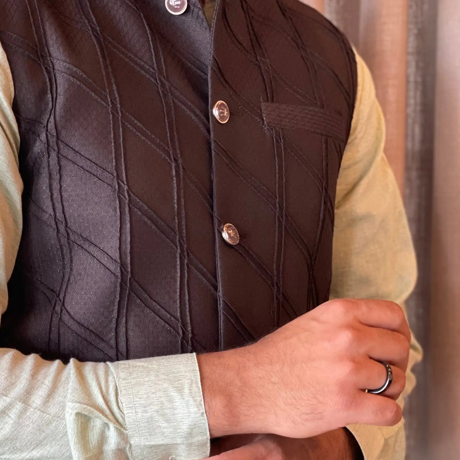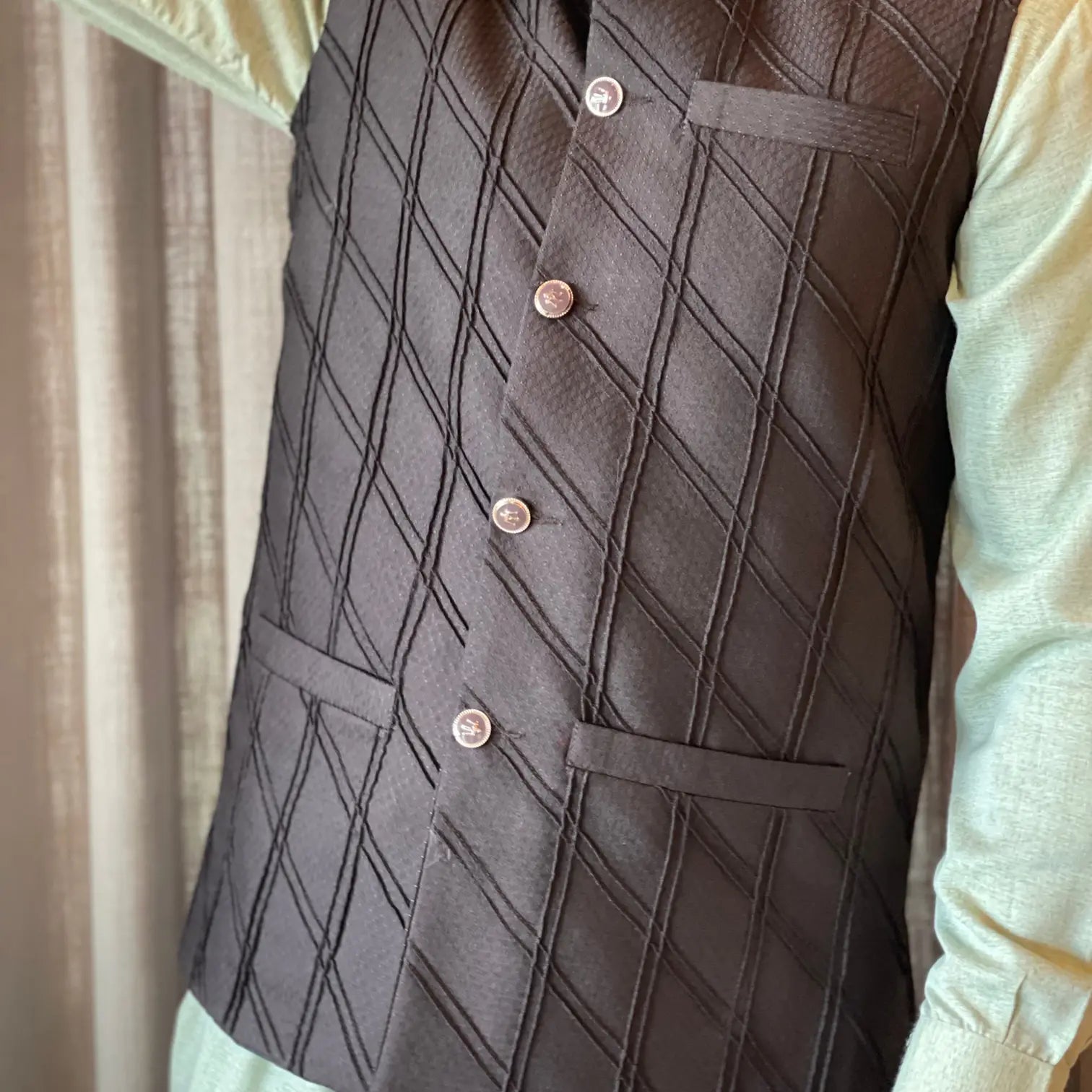 Fully hemmed waistcoat in the color Coffee Brown. The gorgeous material is a cotton silk blend which won’t compromise your comfort.