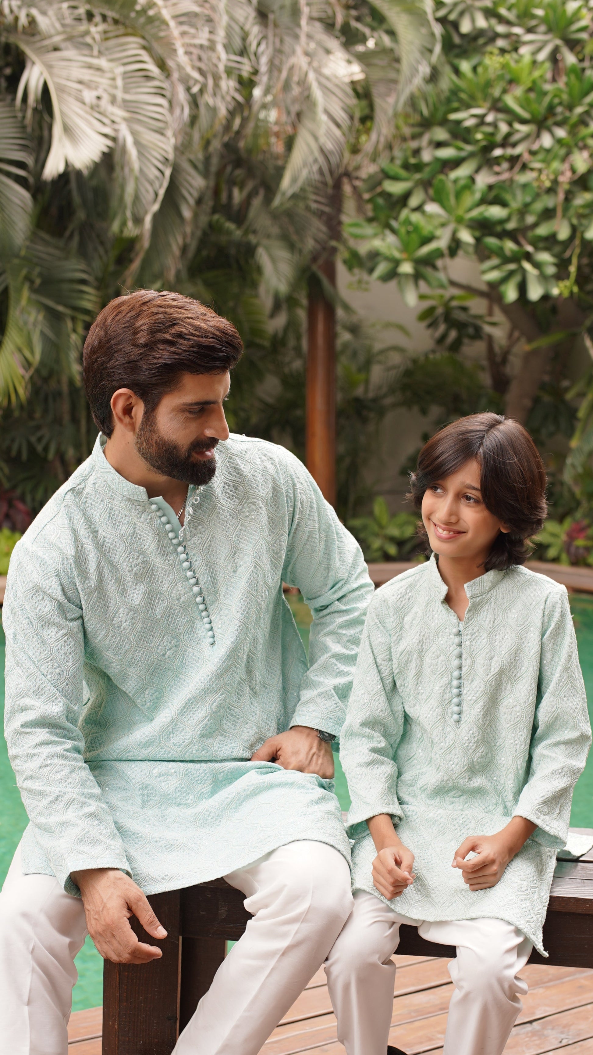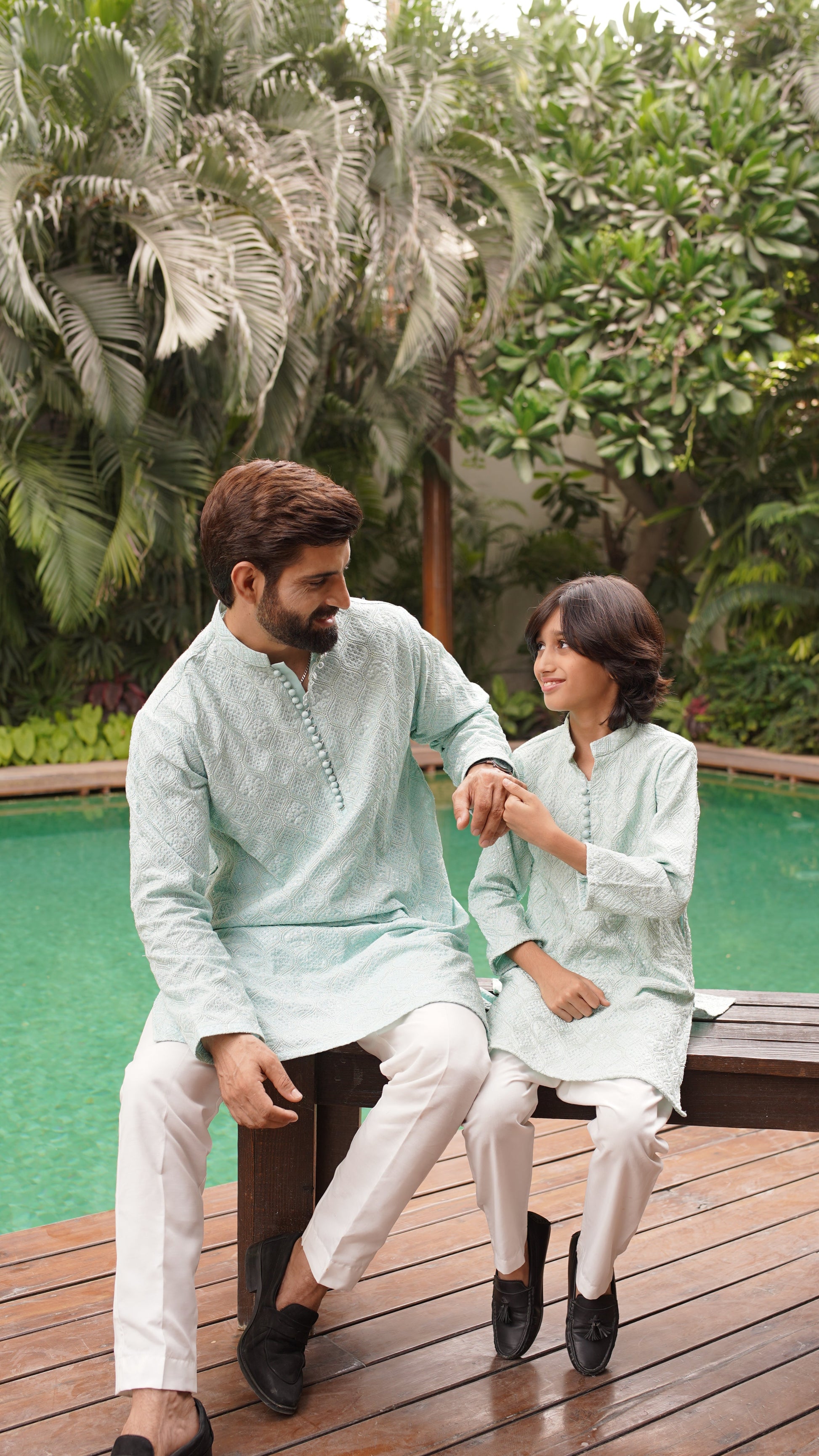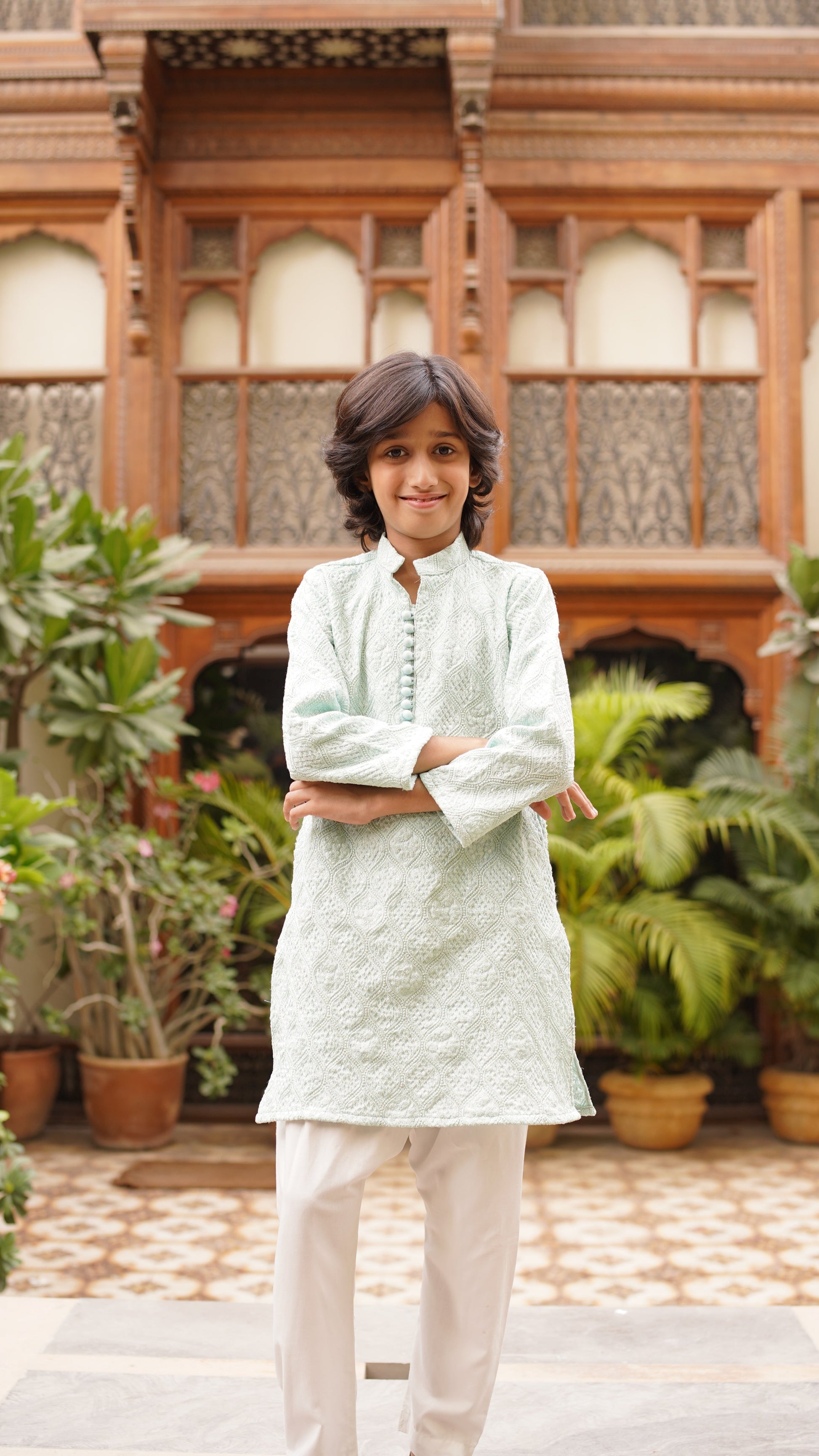 Embroidery all over with water sequins, ball buttons, white pajama, kurta color is light blue