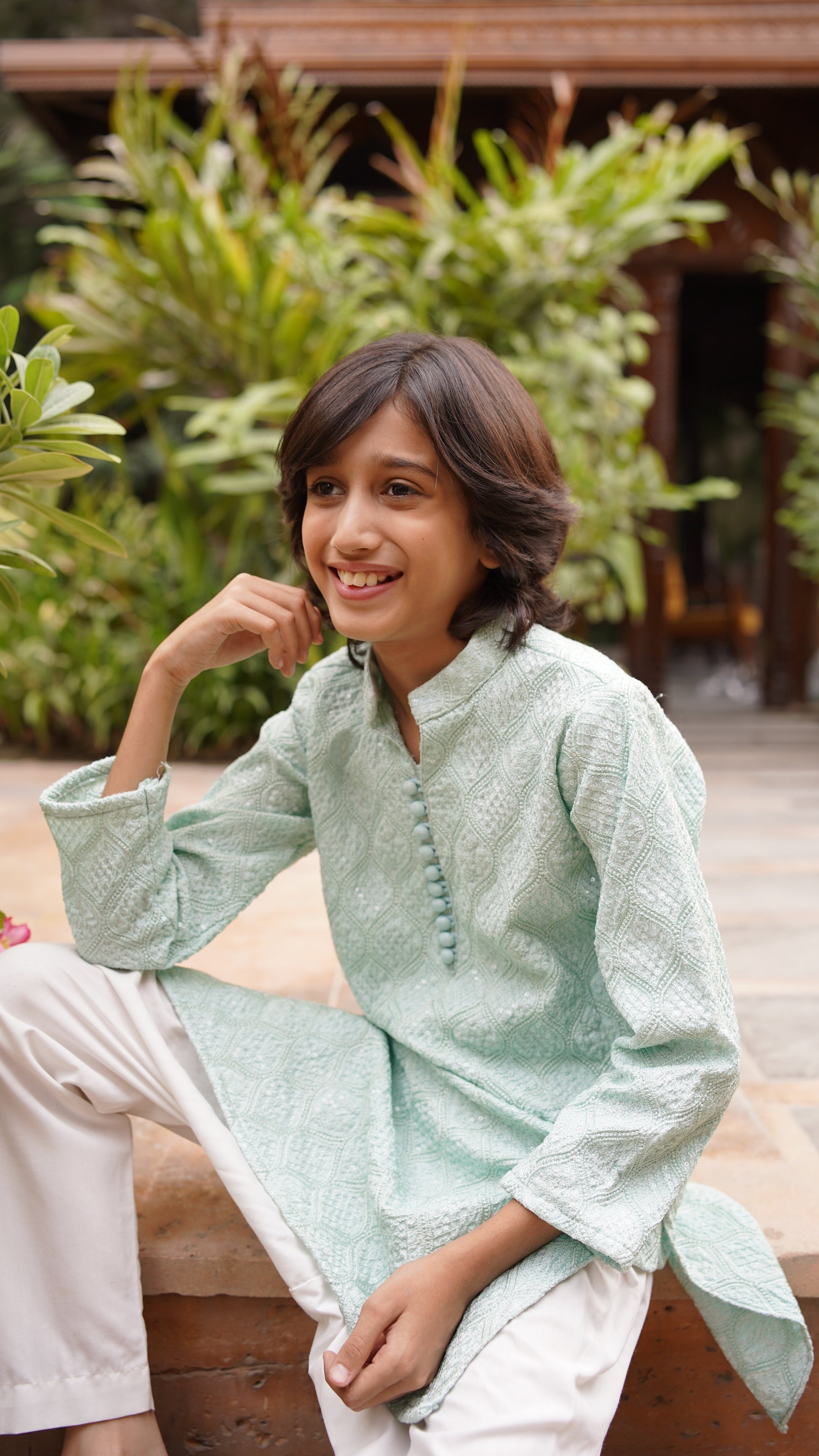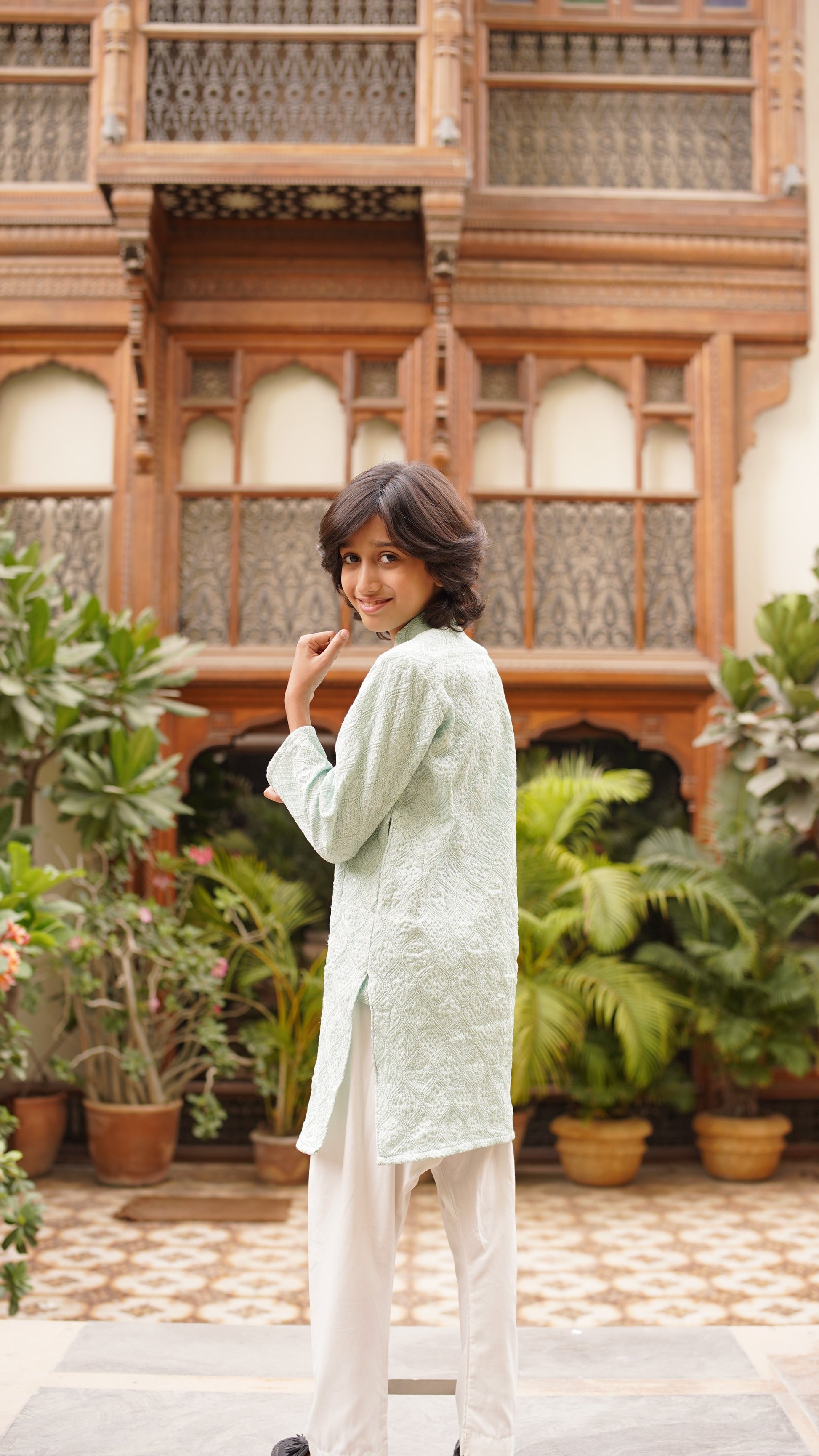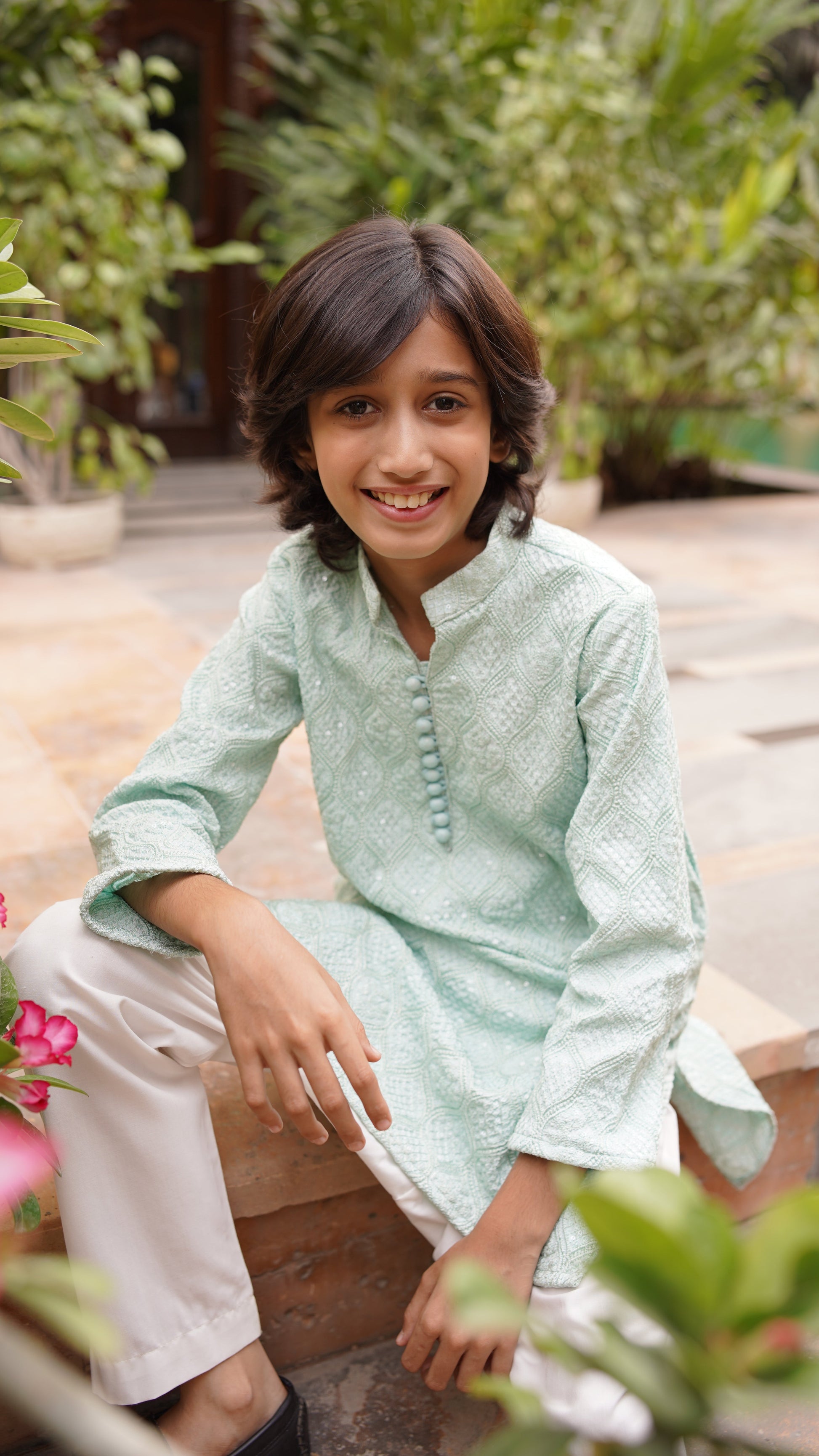 Embroidery all over with water sequins, ball buttons, white pajama, kurta color is light blue