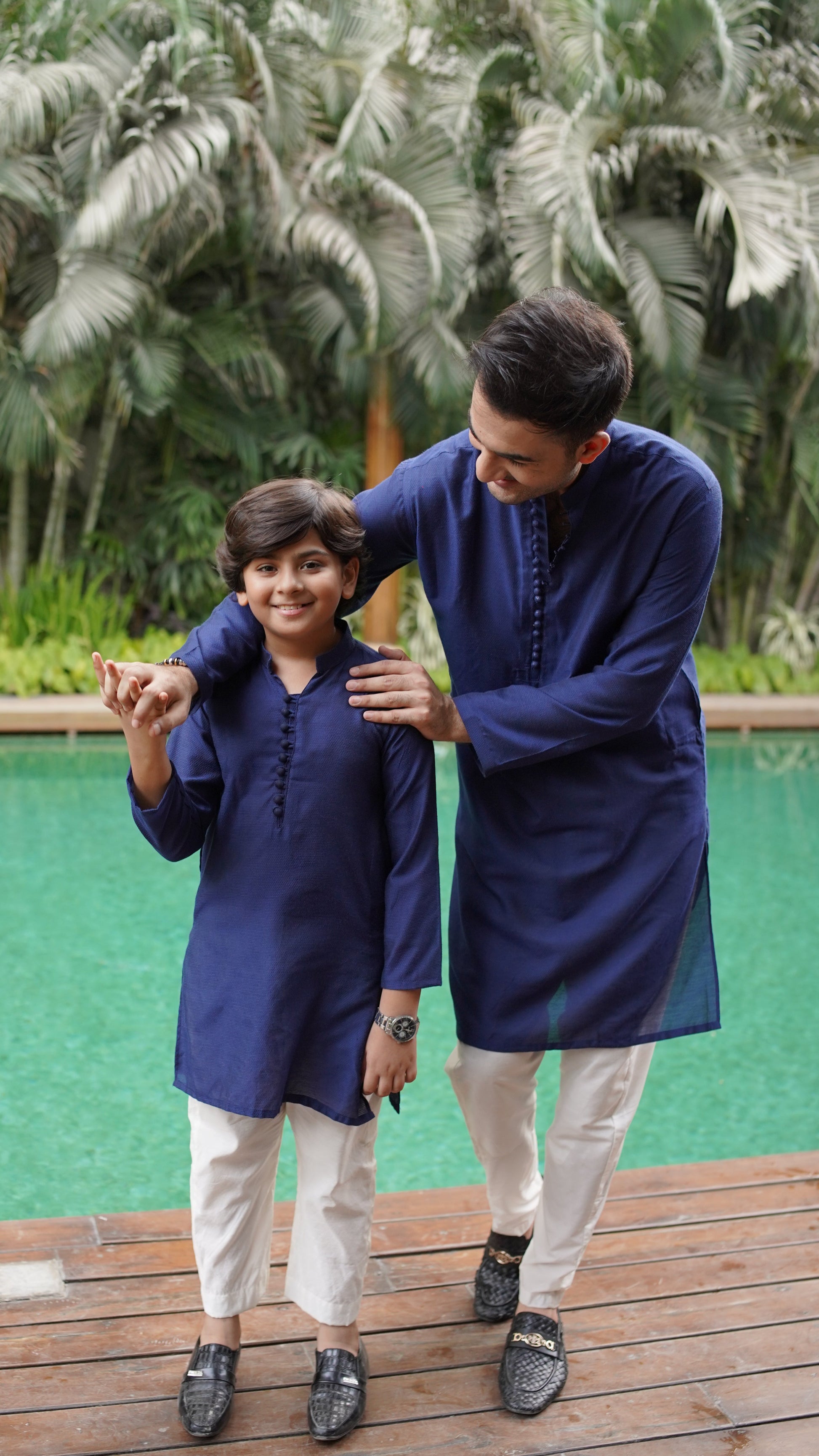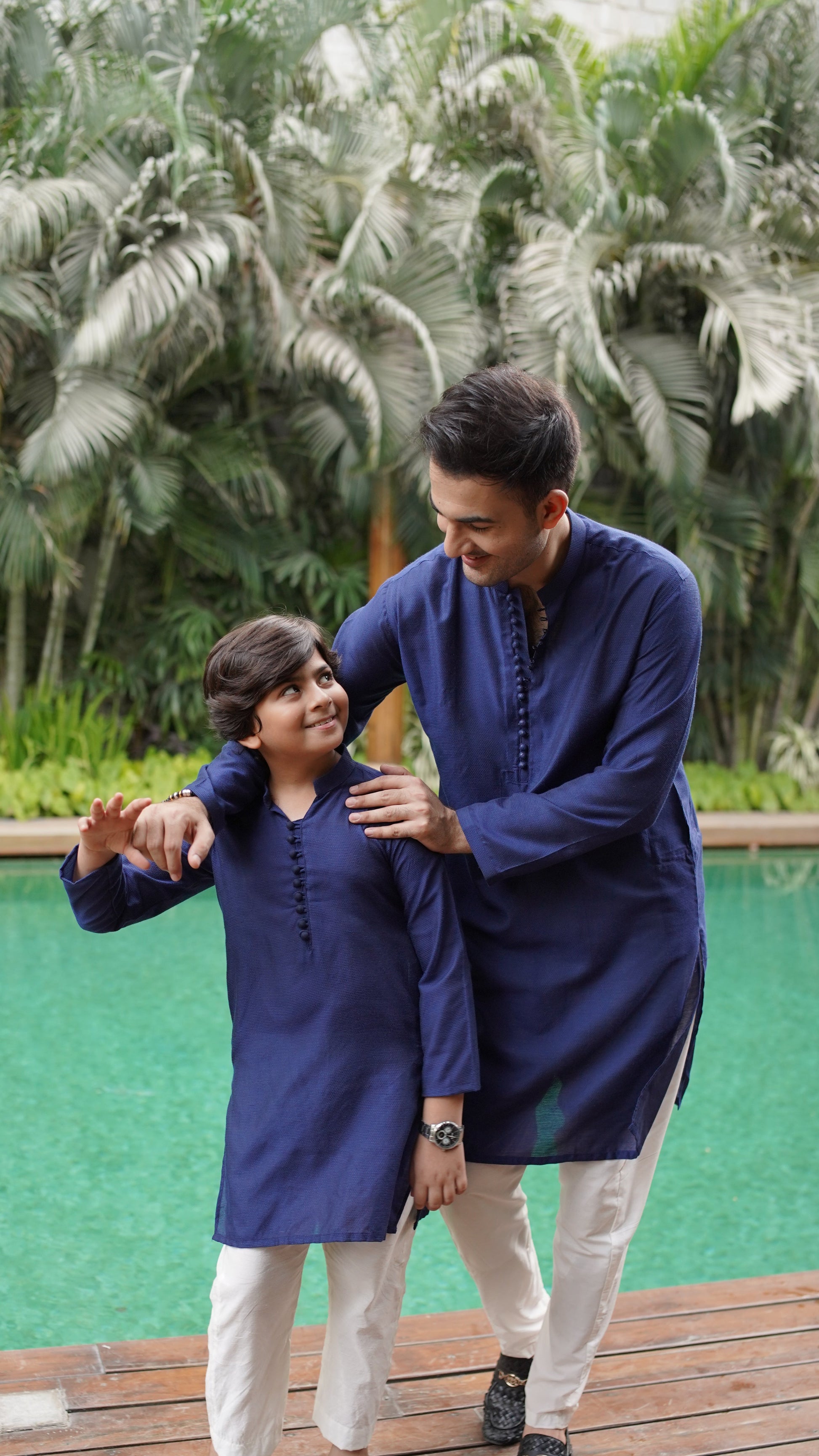 Kurta is khaddi cotton Jacquard self imbossed, with ball buttons, white pajama, kurta color is dark blue