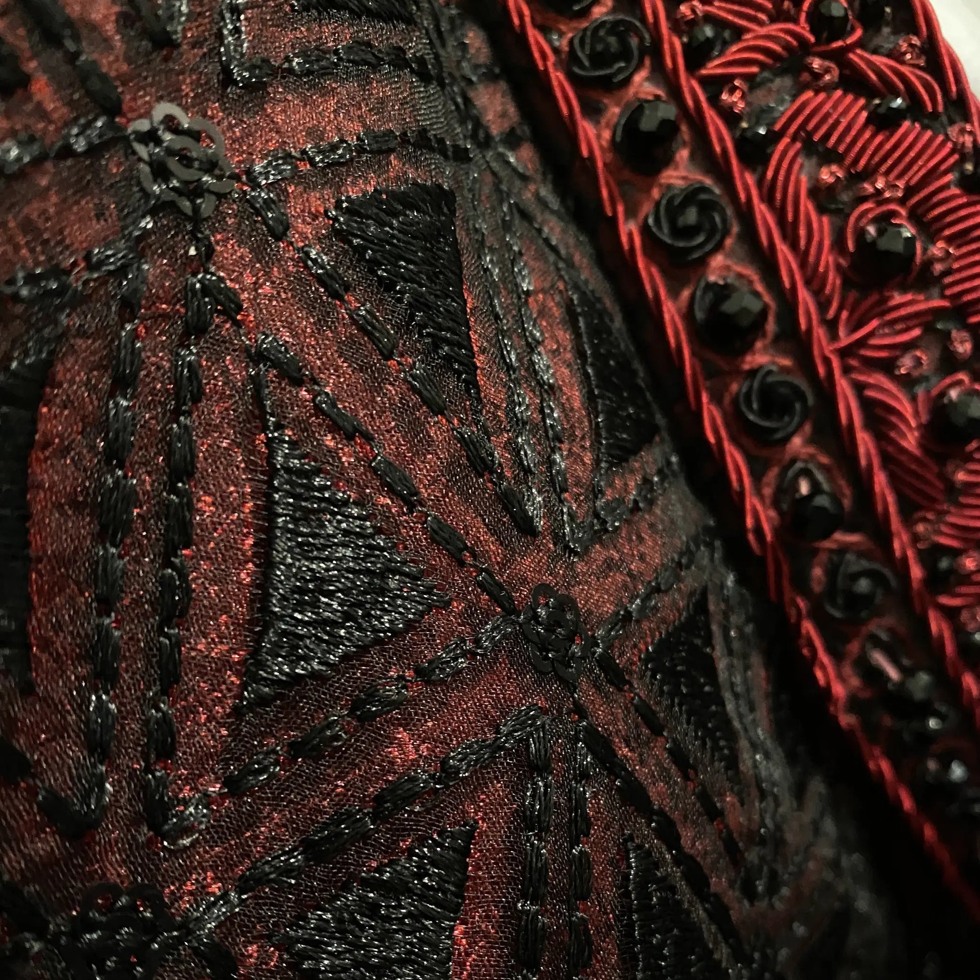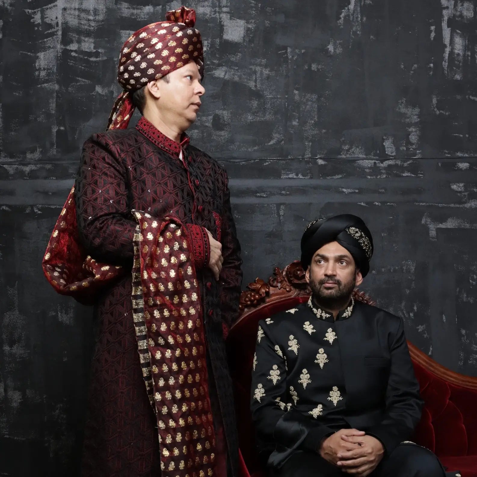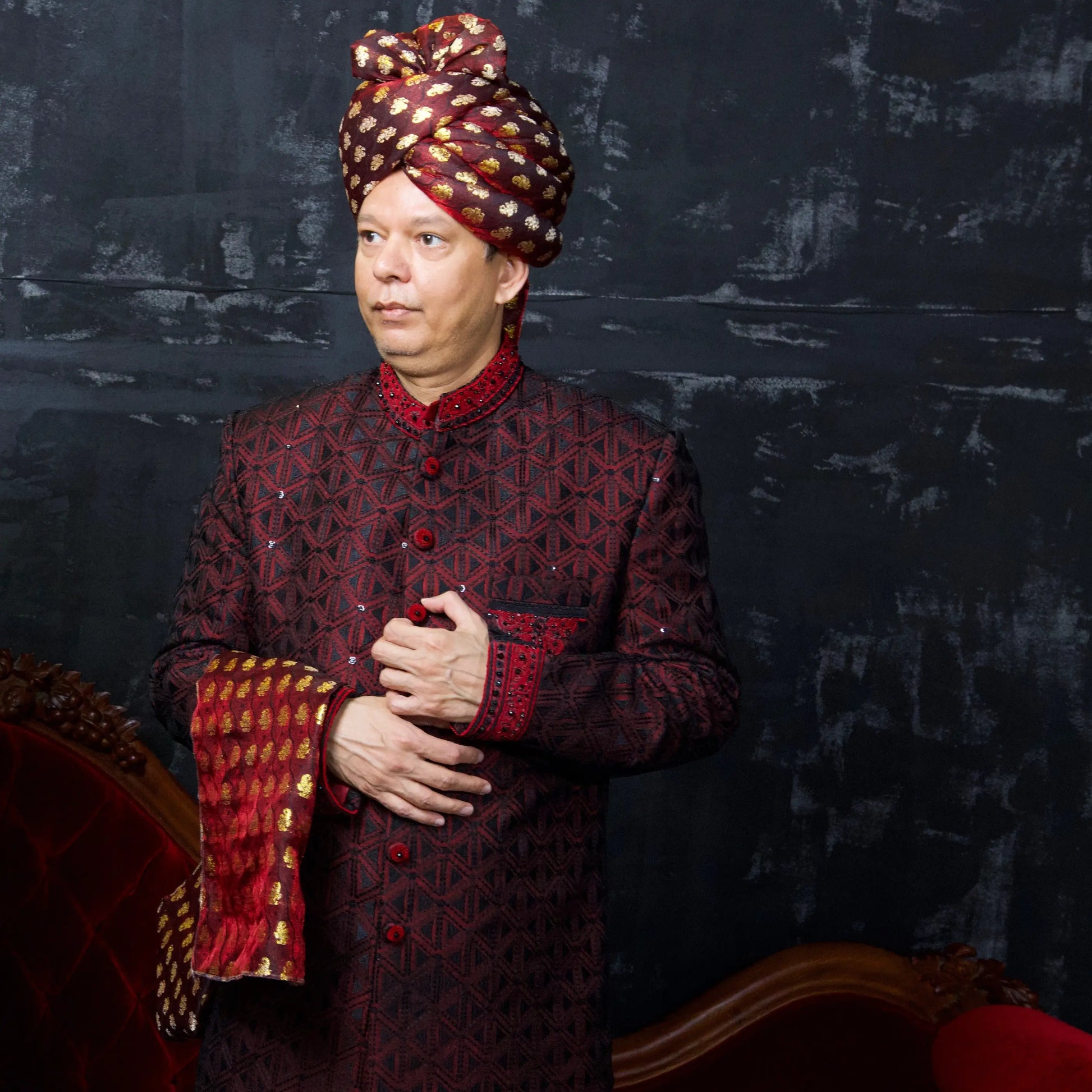 Sherwani is a long coat-like garment worn to signify Elegance and Style by the groomsmen and the groom himself. Lava Stone is designed with Red and Black details on a double layered maroon net base.