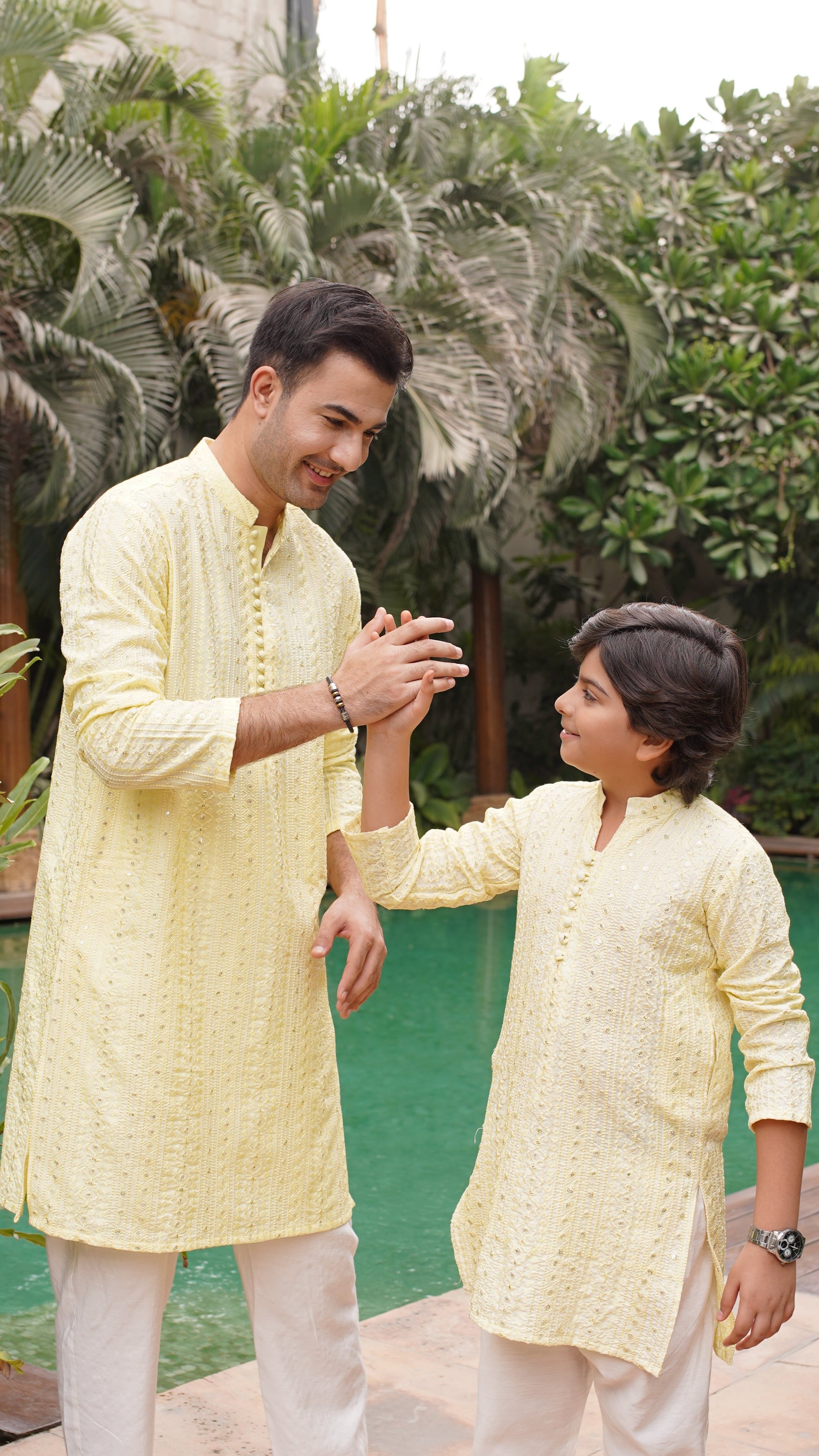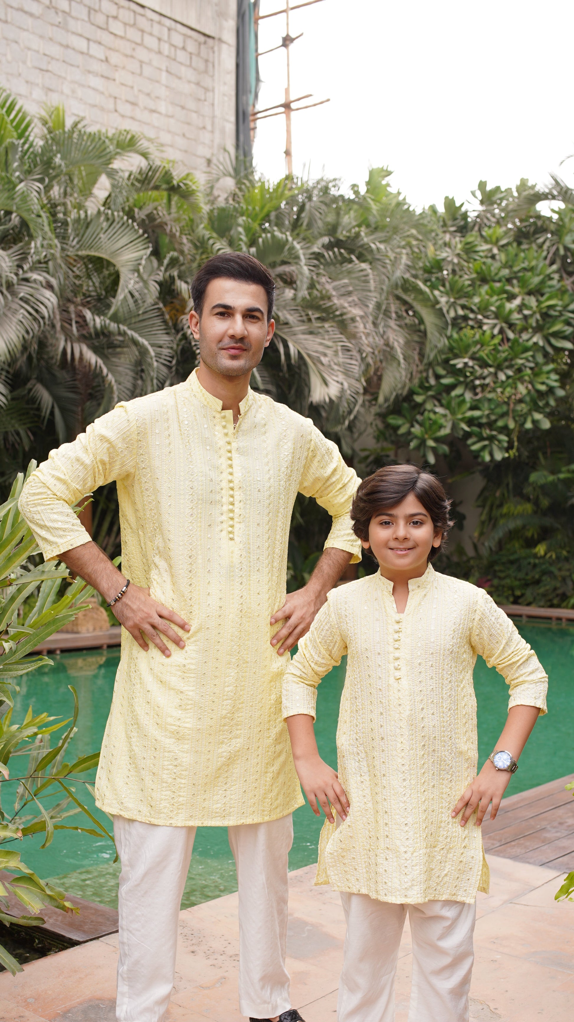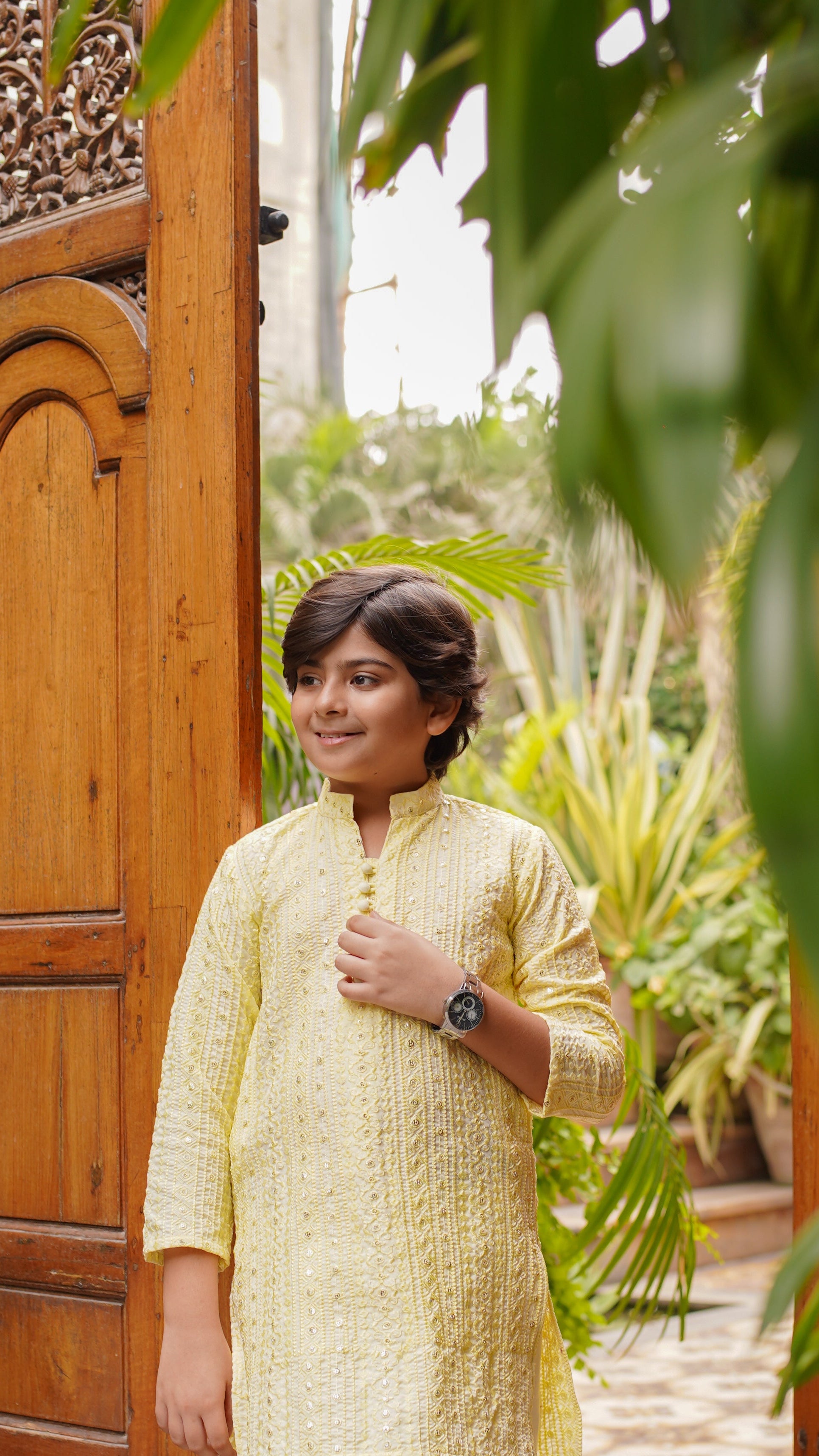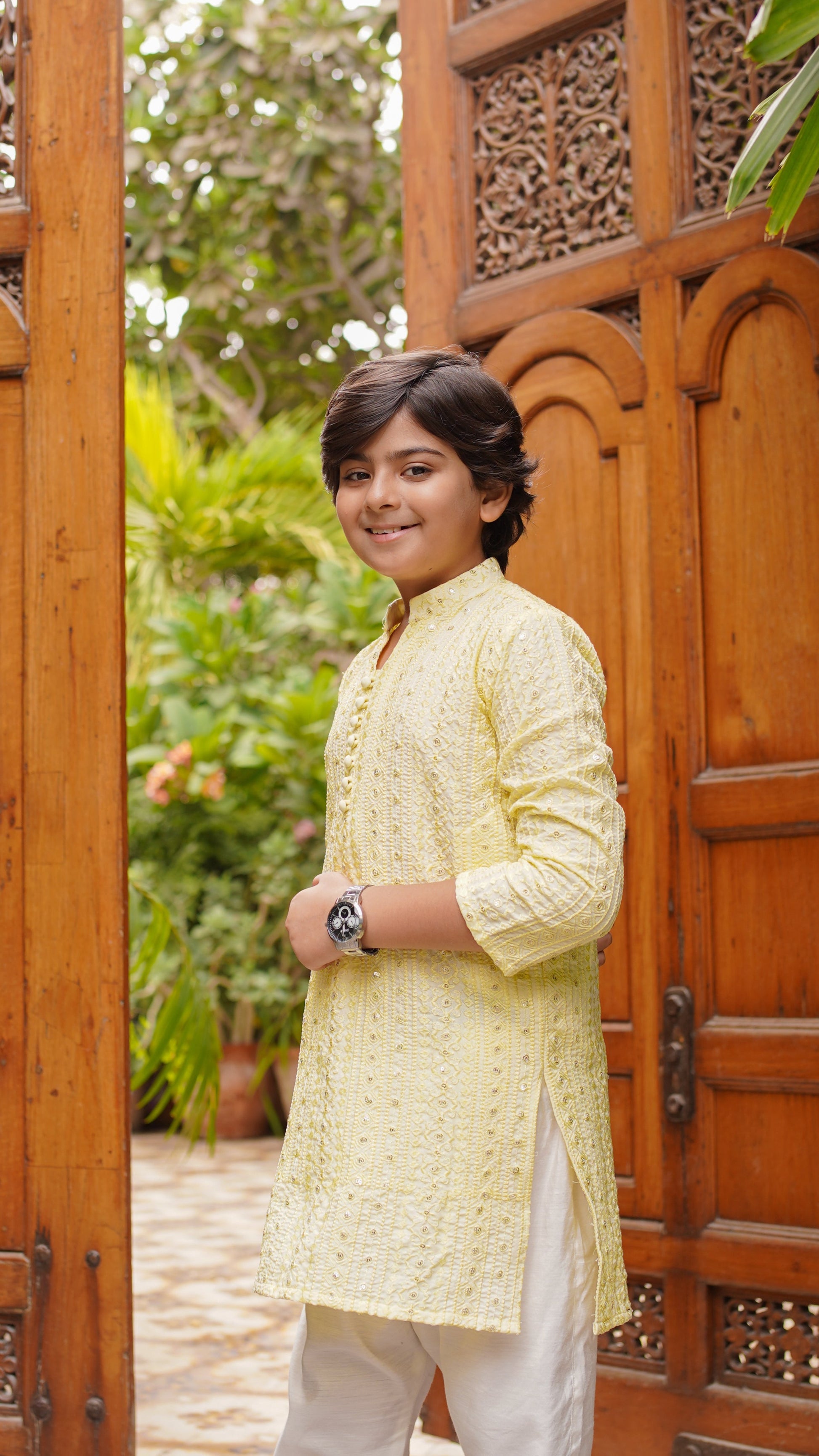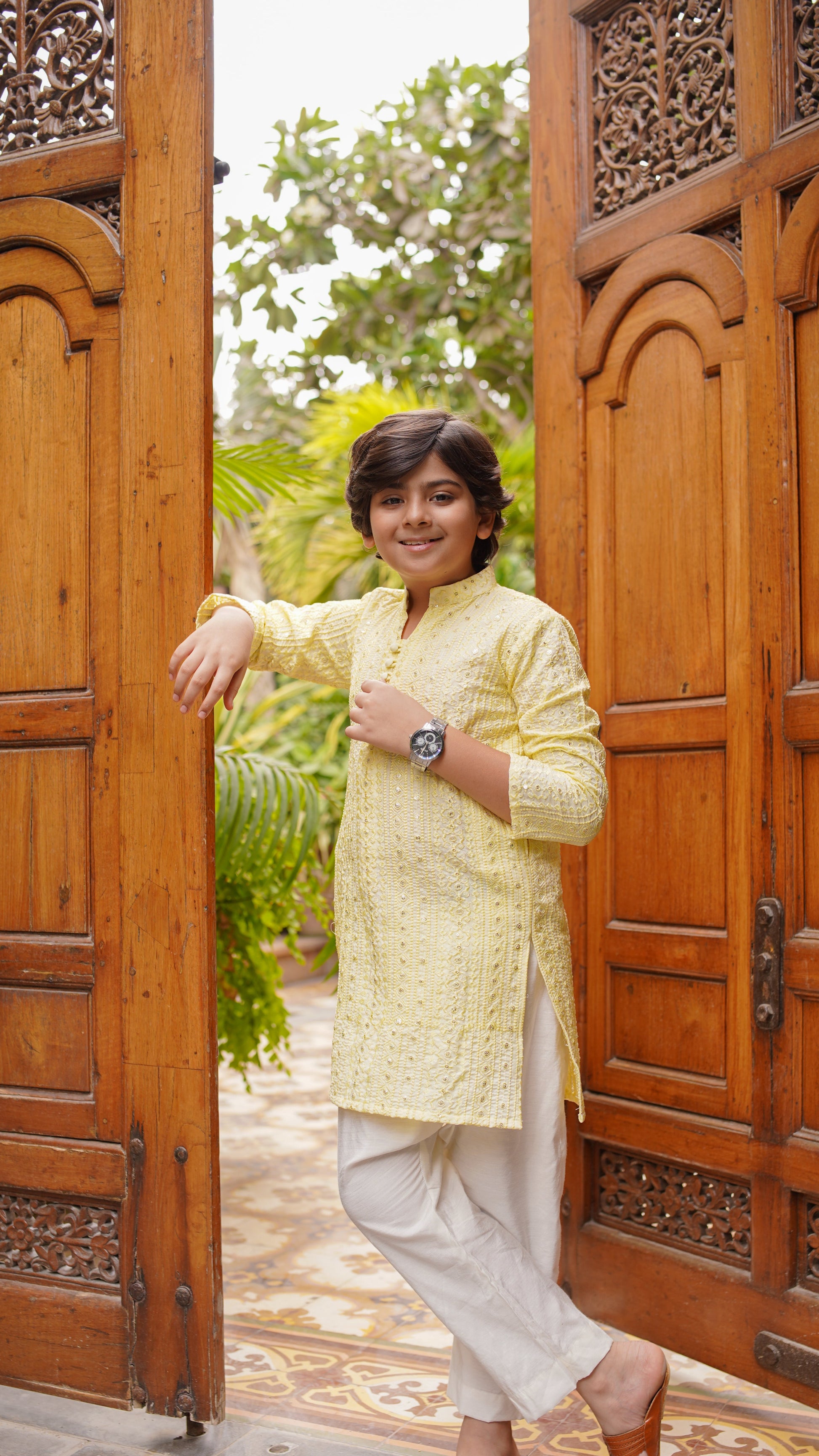 Embroidery with mirror sequins in the color gold, ball buttons, white pajama, kurta color is light yellow