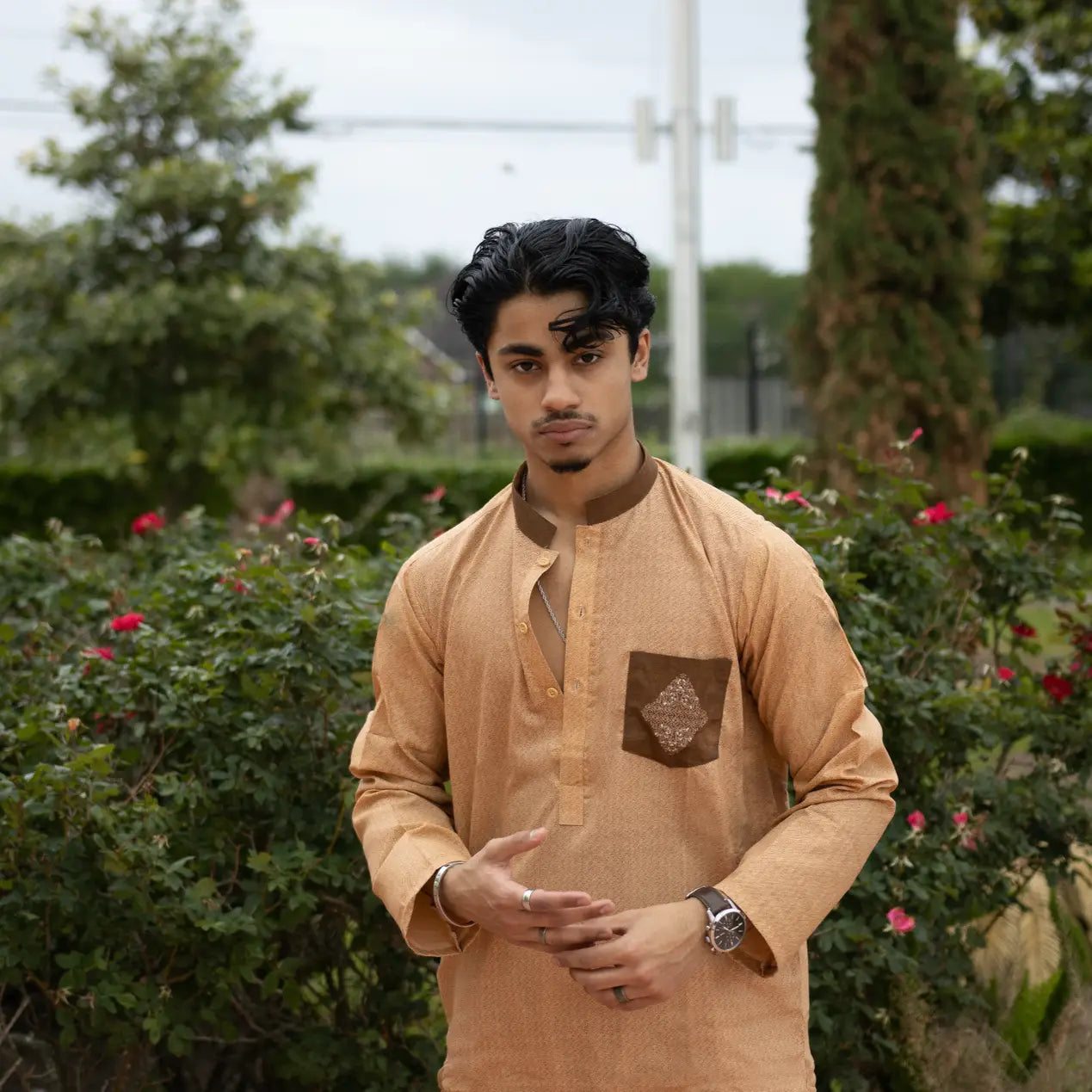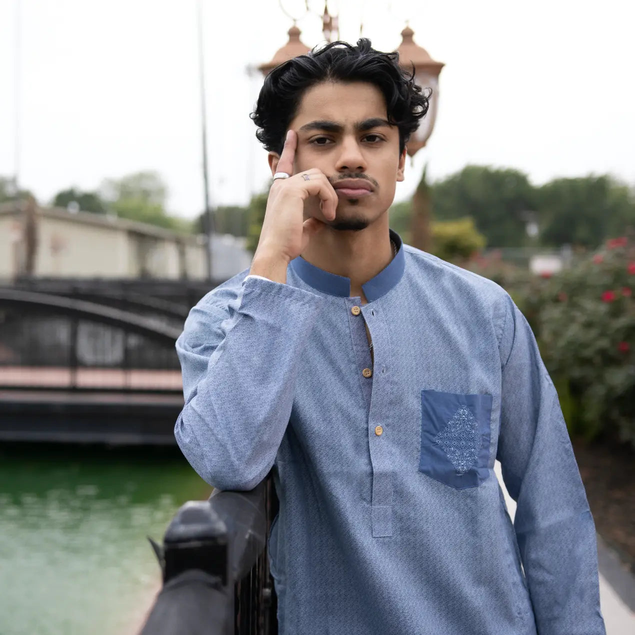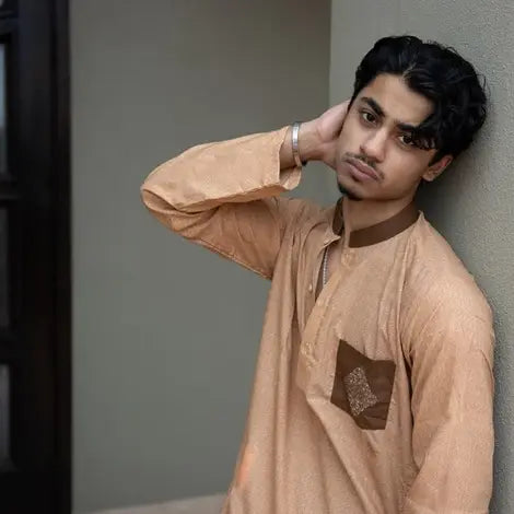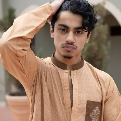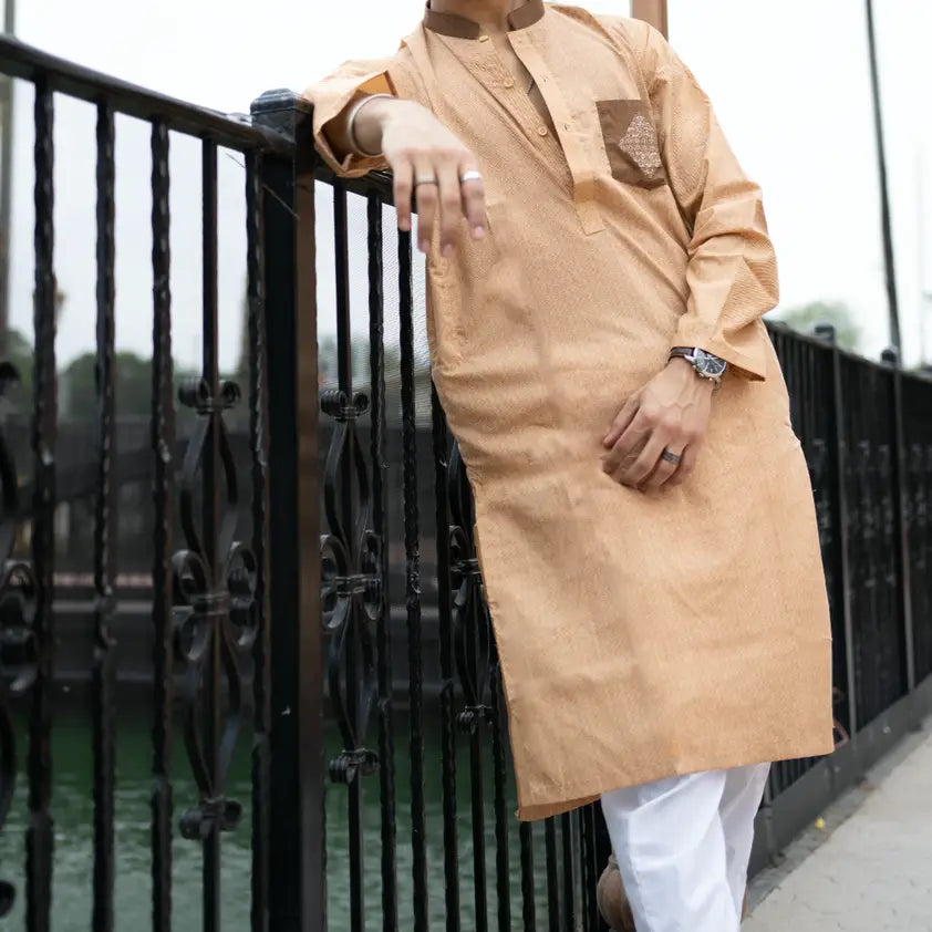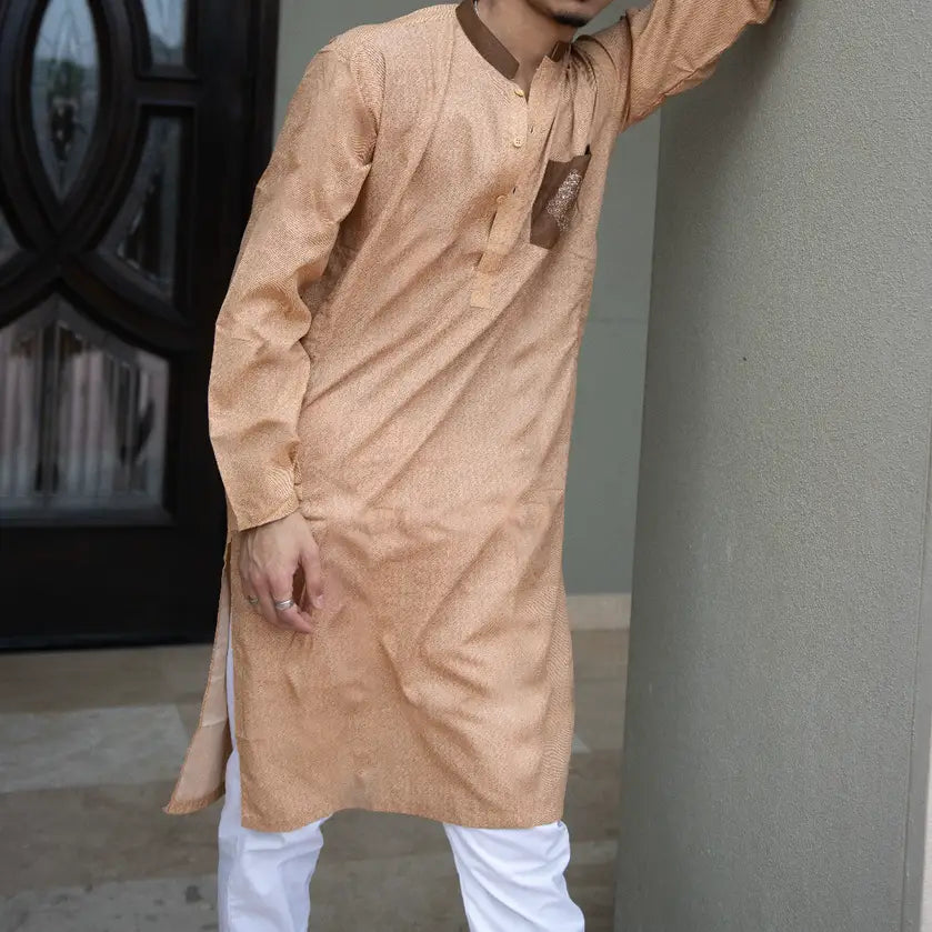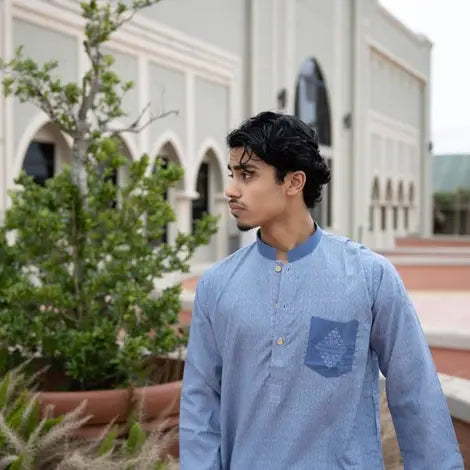 This self printed Kameez comes in 3 colors: Pink, Blue, and Orange. Very unique and stylish wear for men for any occasions. This is a one piece kurta only. Crescent is designed to have the pocket a darker shade of the same color to add a little twist and beauty to each piece.