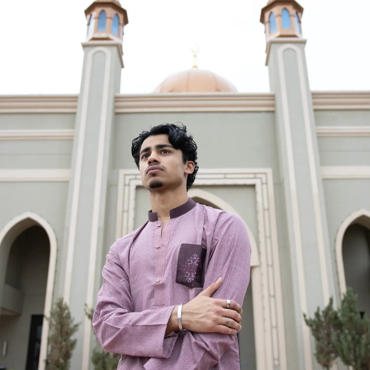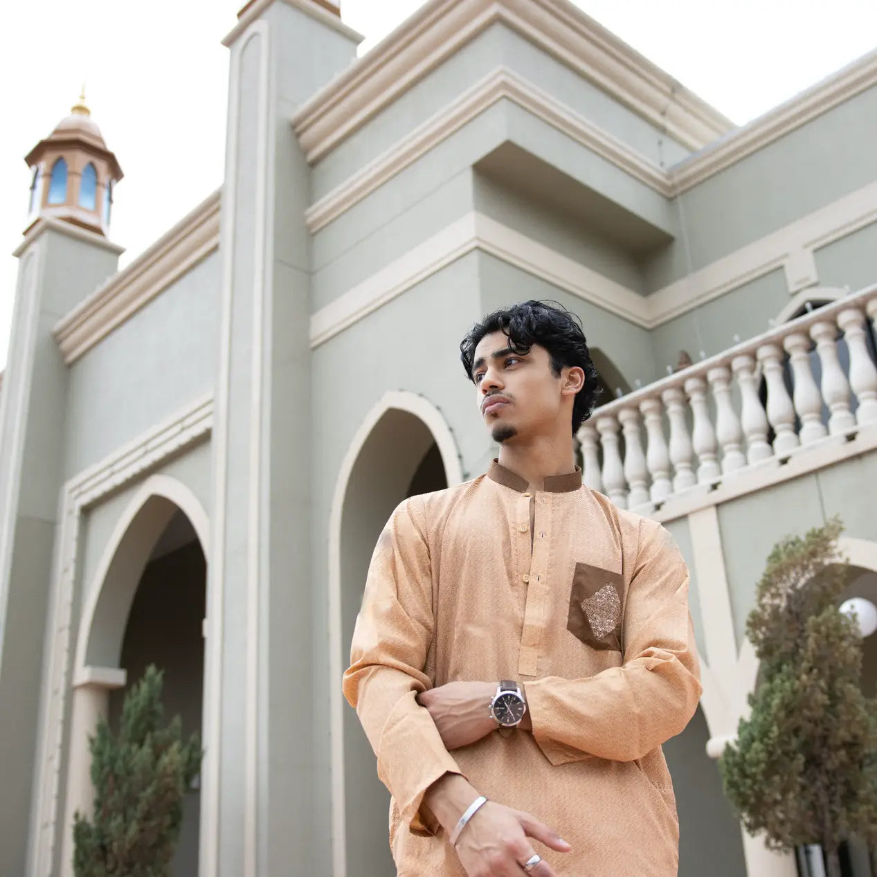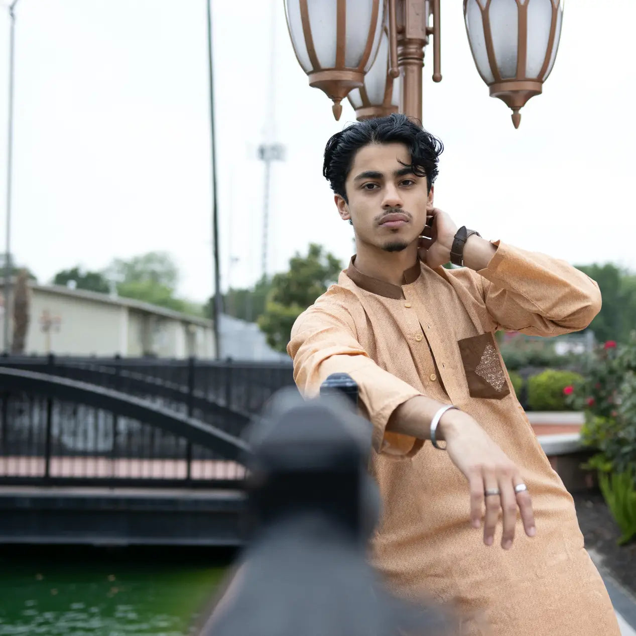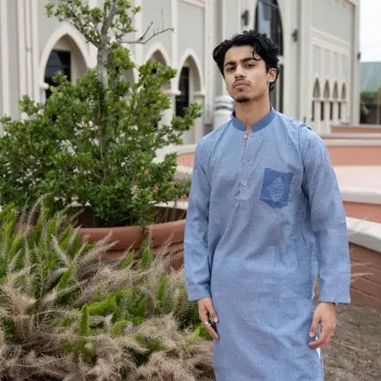 This self printed Kameez comes in 3 colors: Pink, Blue, and Orange. Very unique and stylish wear for men for any occasions. This is a one piece kurta only. Crescent is designed to have the pocket a darker shade of the same color to add a little twist and beauty to each piece.