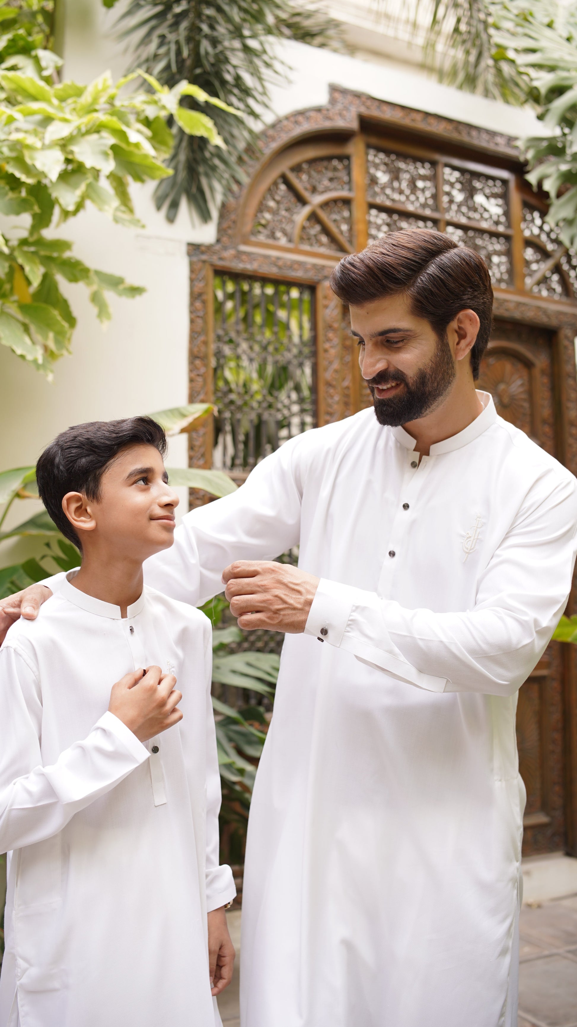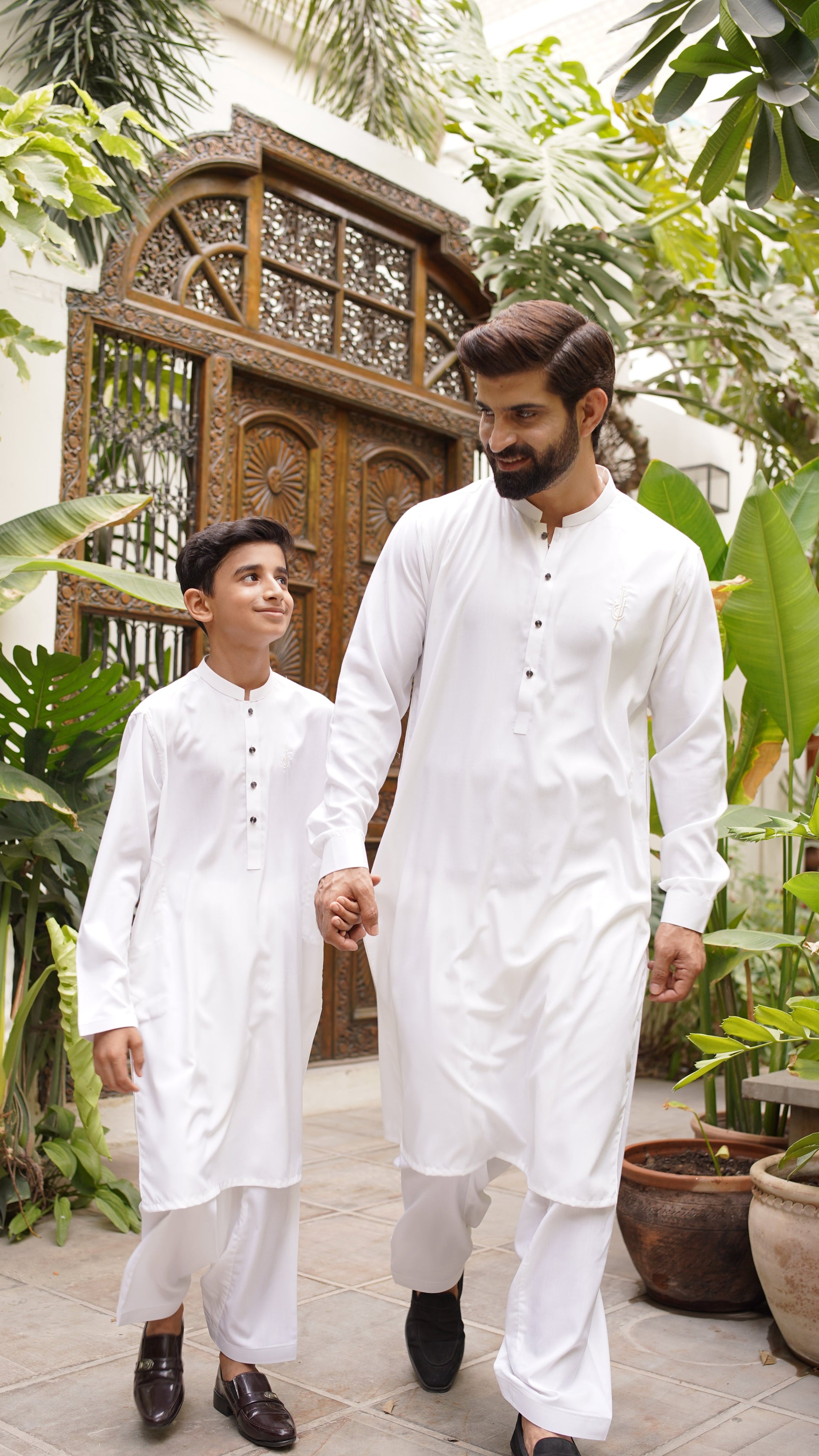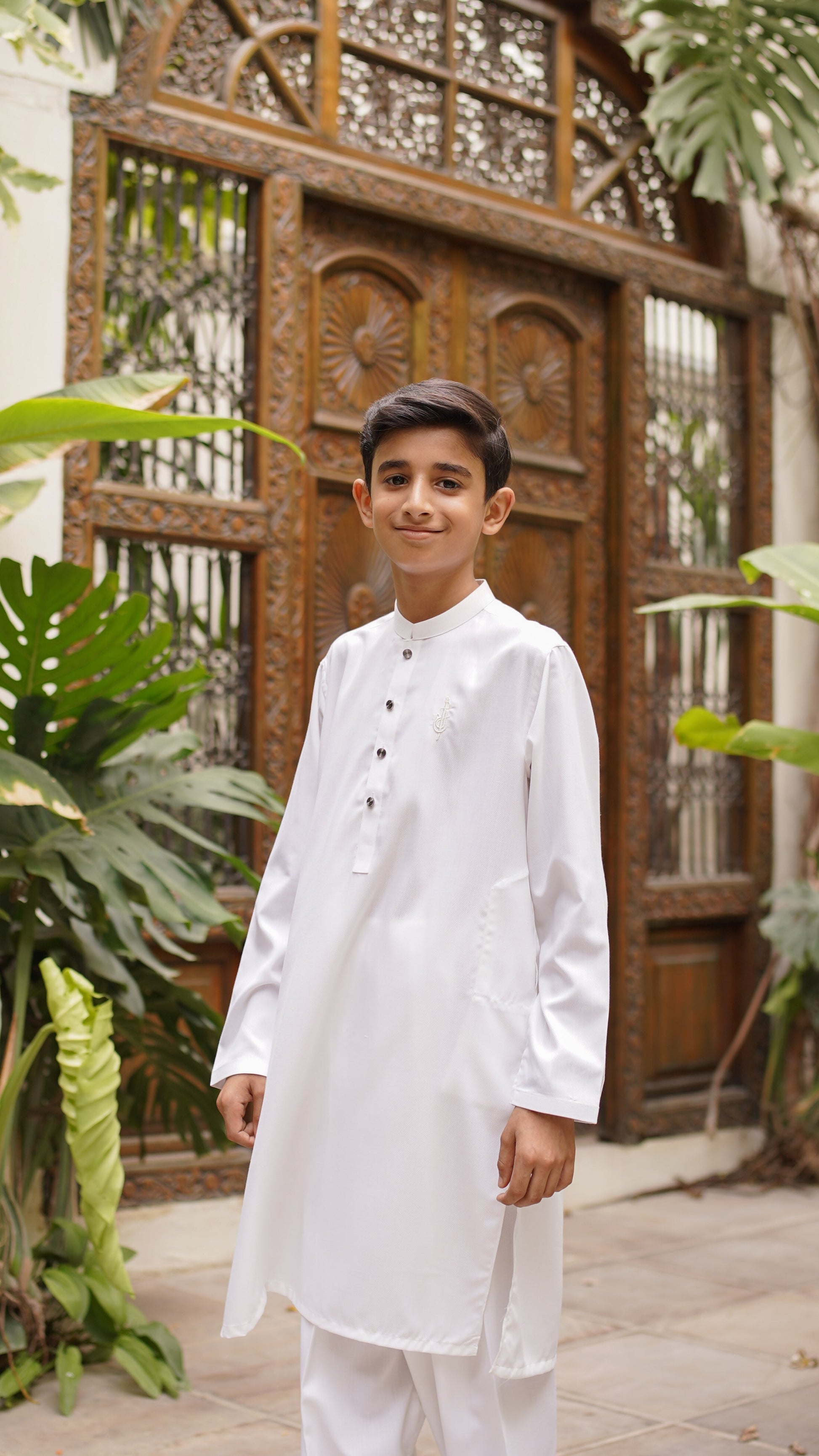 Shalwar Kameez in color: white. Al Ameer logo is embroidered on the left side of the chest. Embroidery color is white.