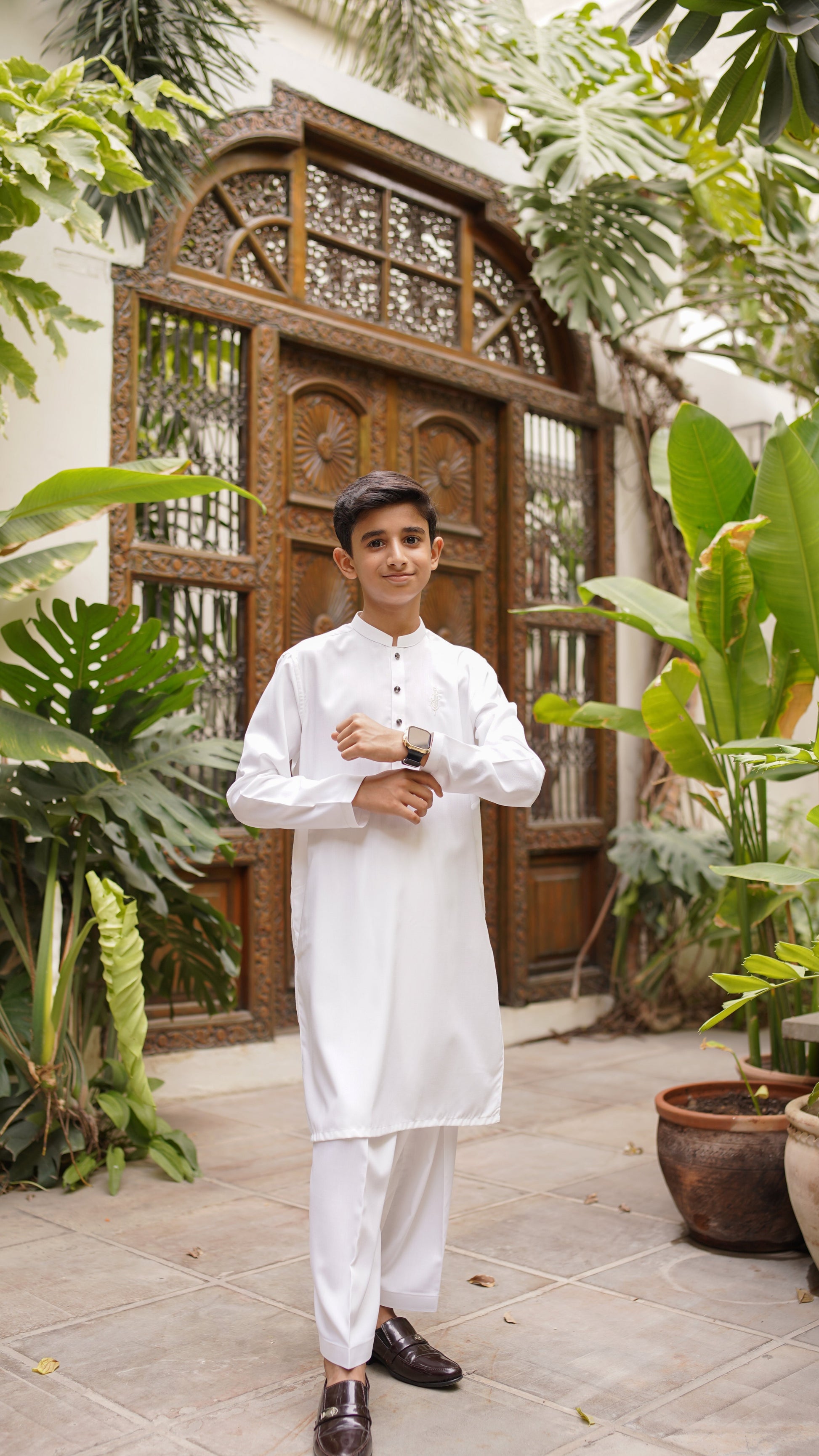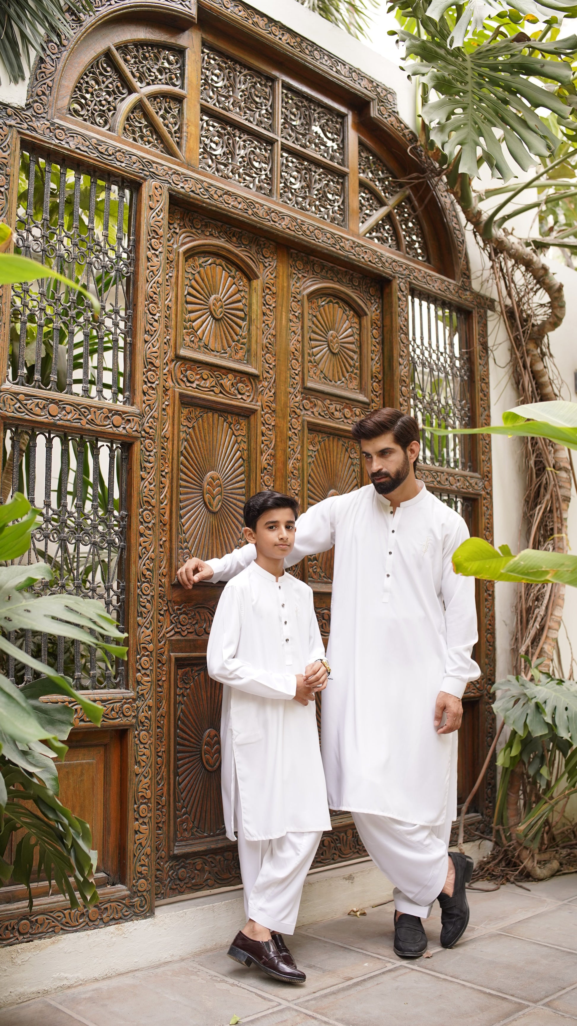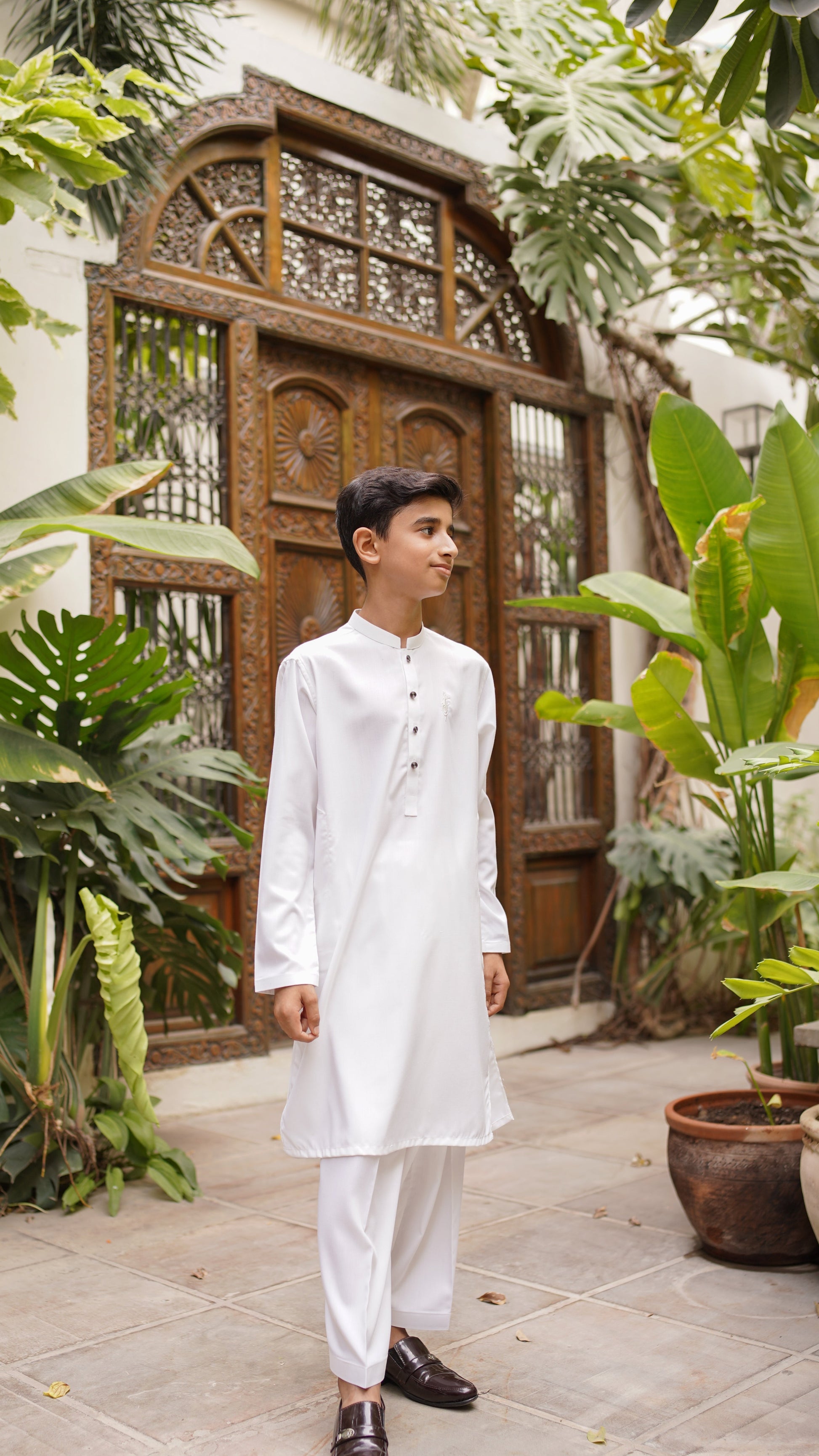 Shalwar Kameez in color: white. Al Ameer logo is embroidered on the left side of the chest. Embroidery color is white.