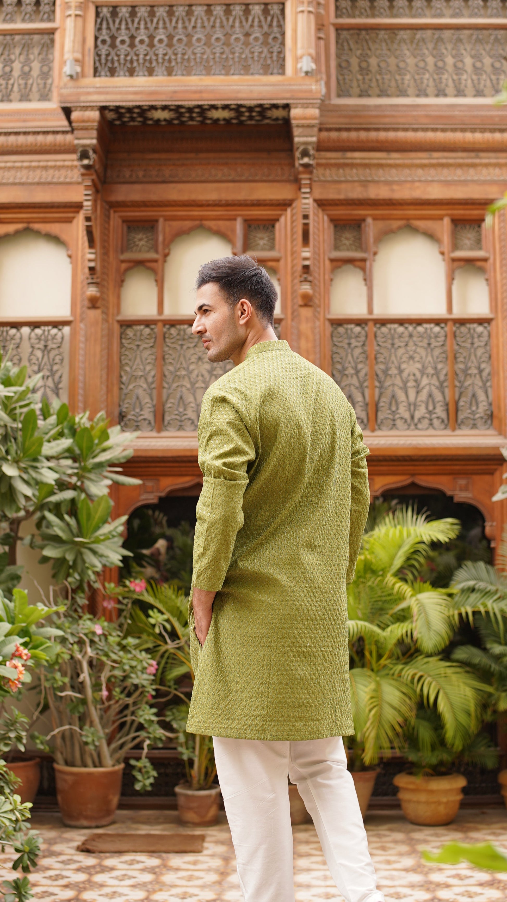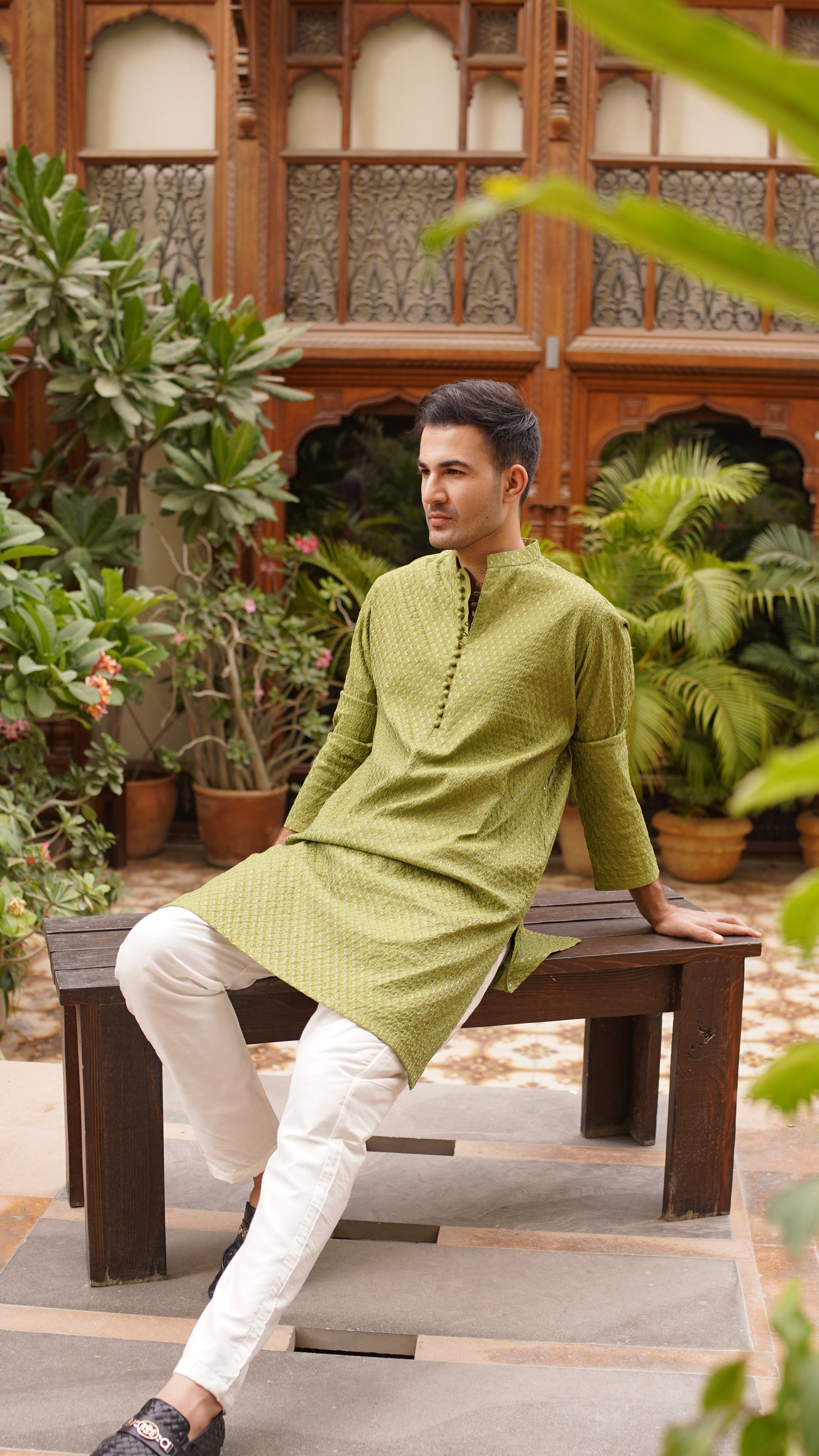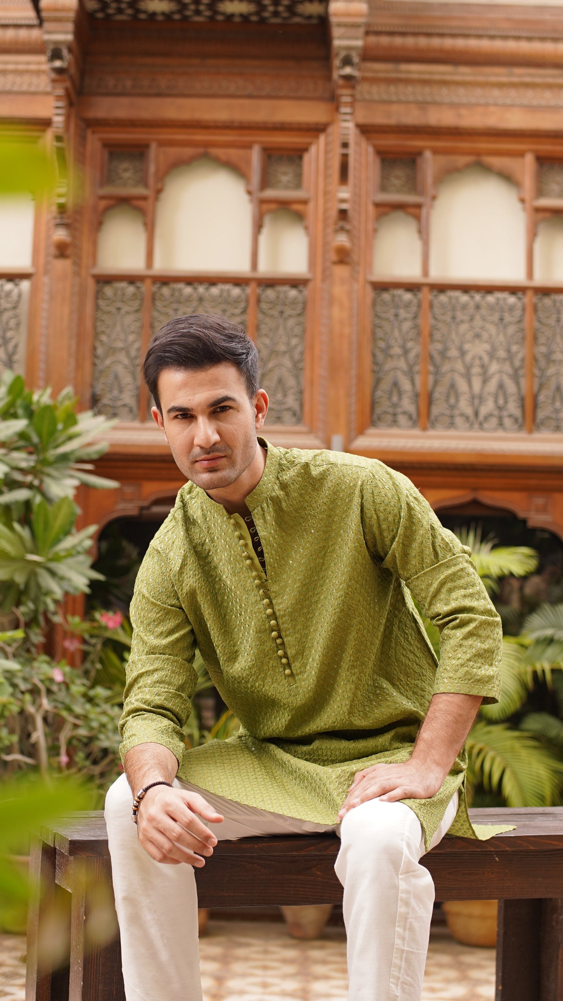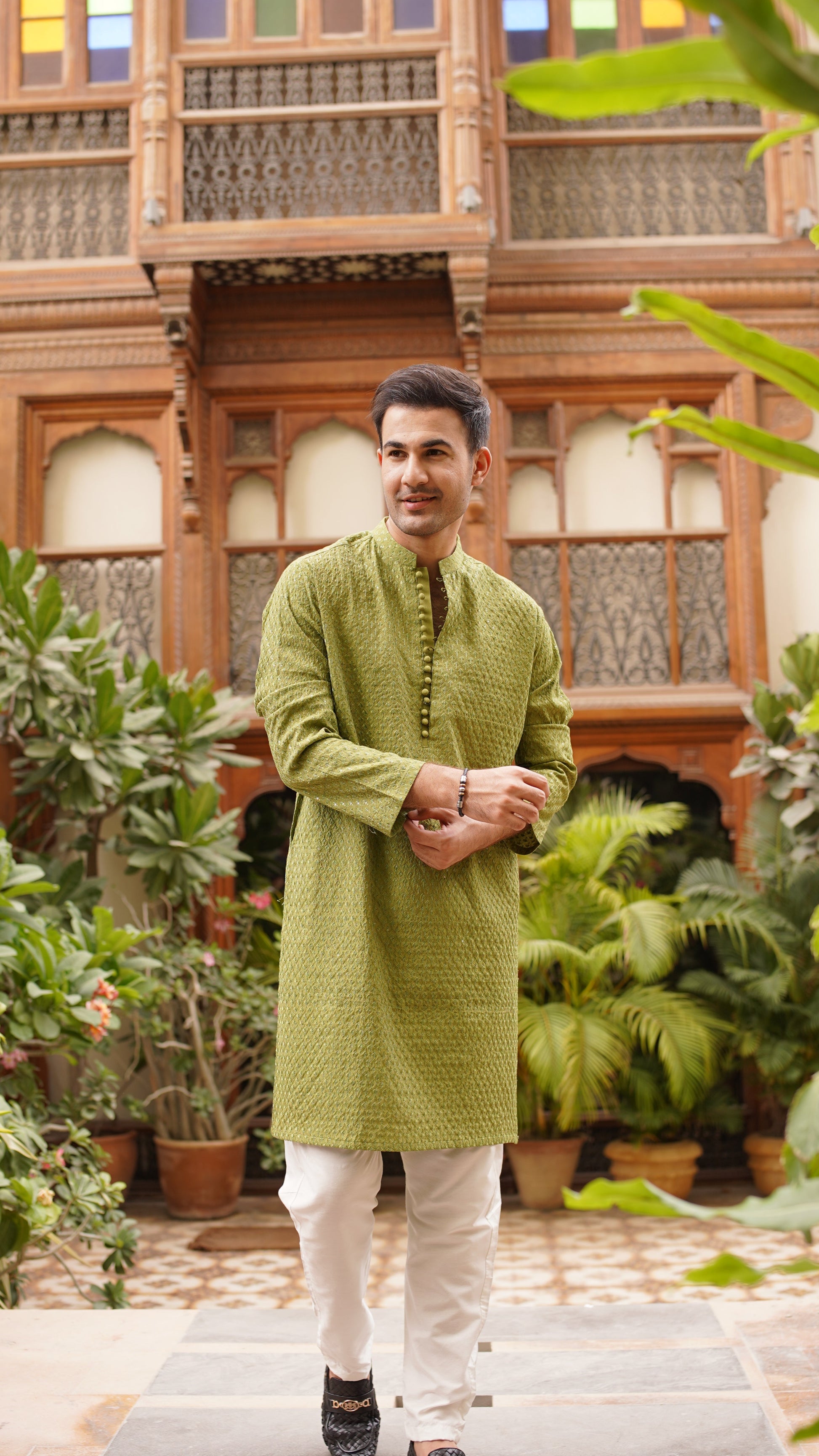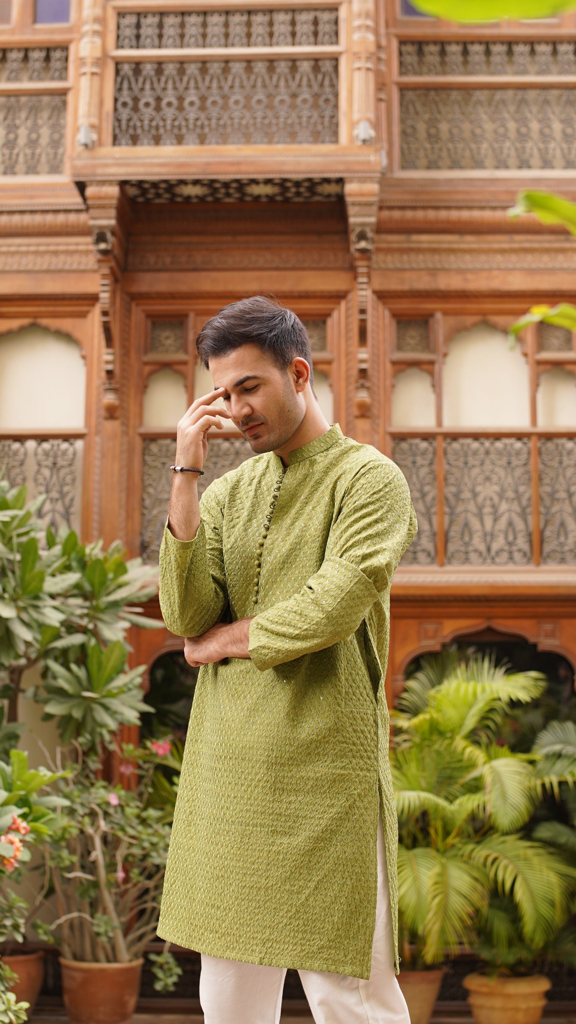 Embroidery with clear sequins, ball buttons, white pajama, kurta color is moss green