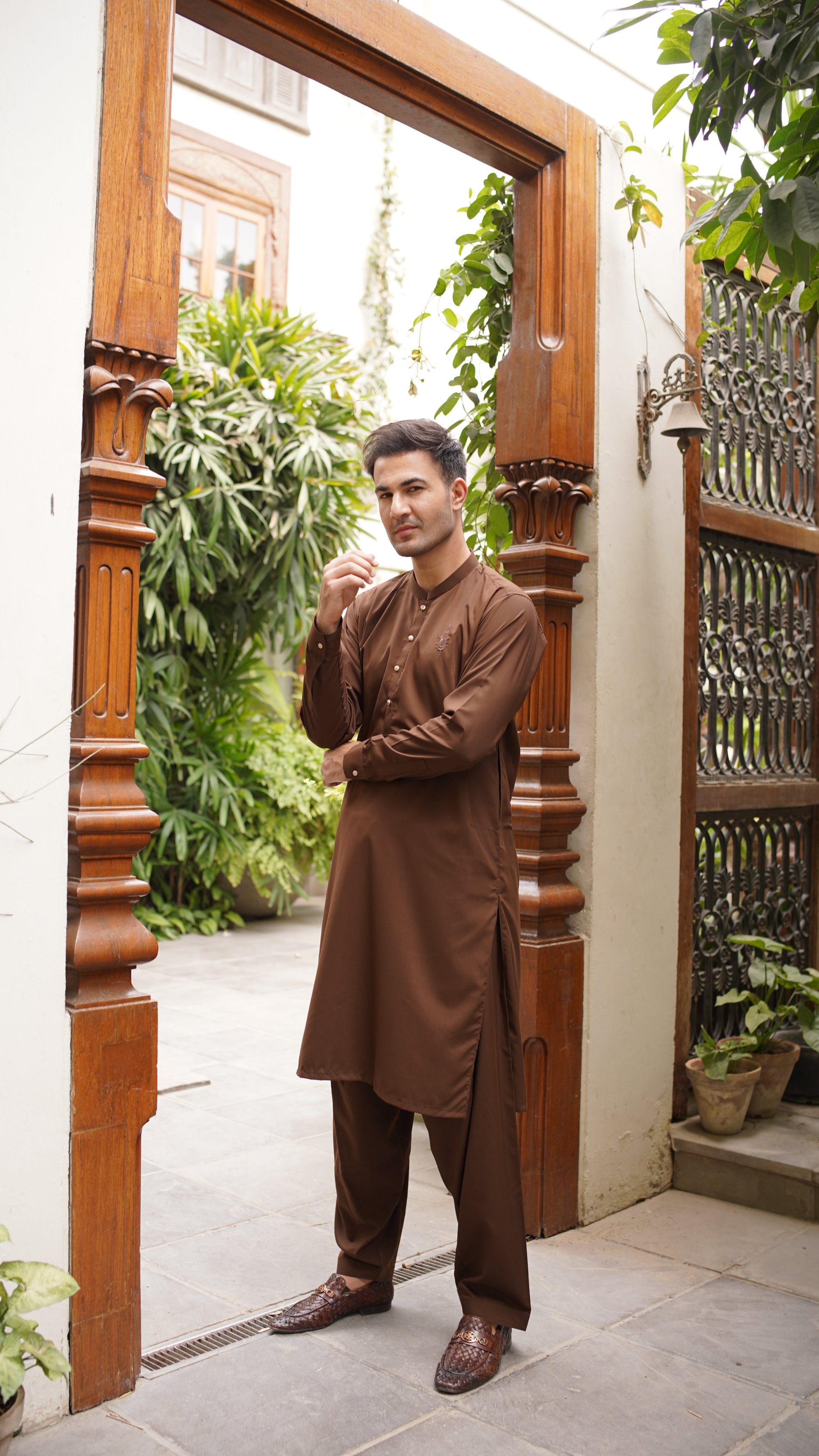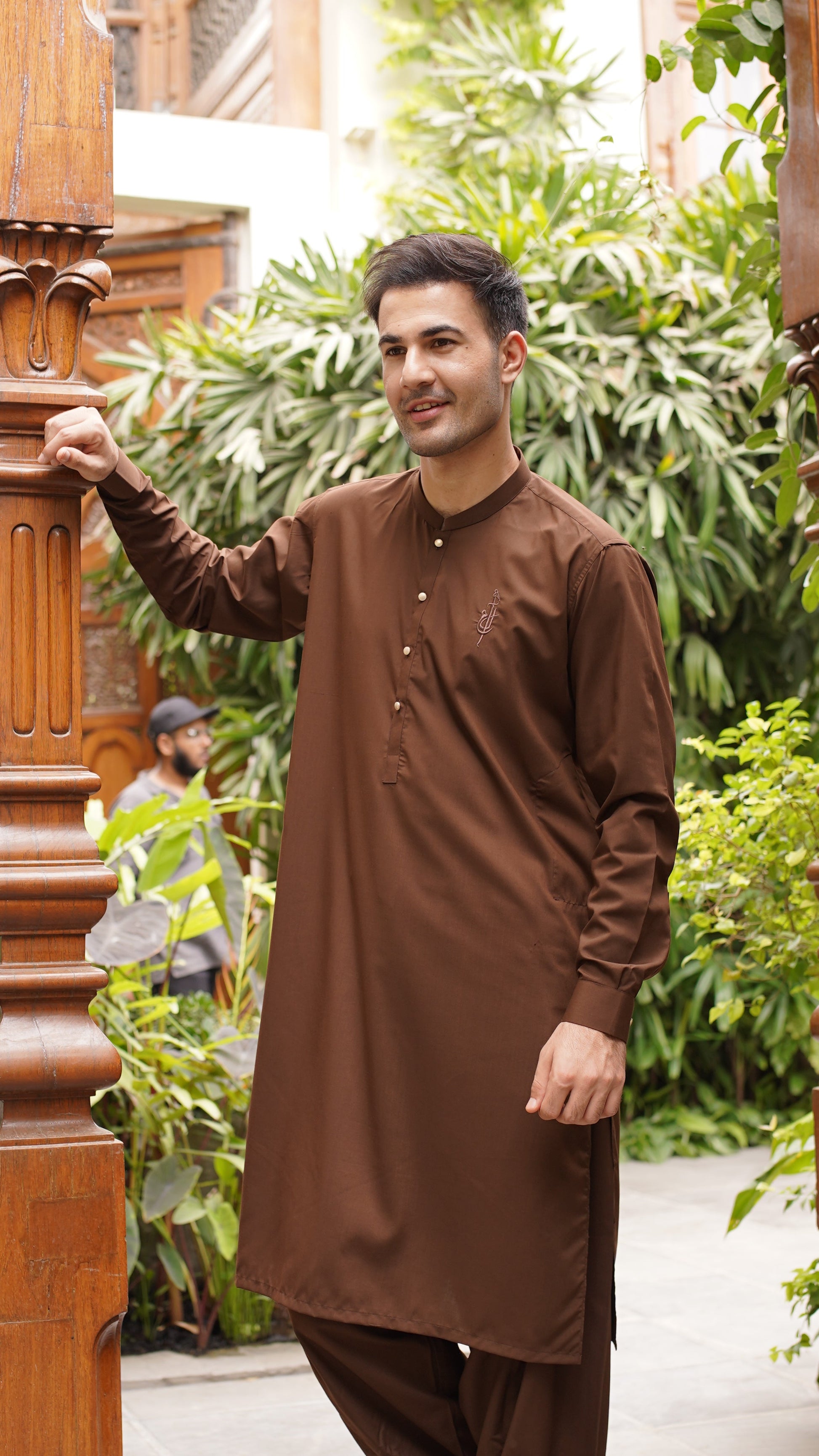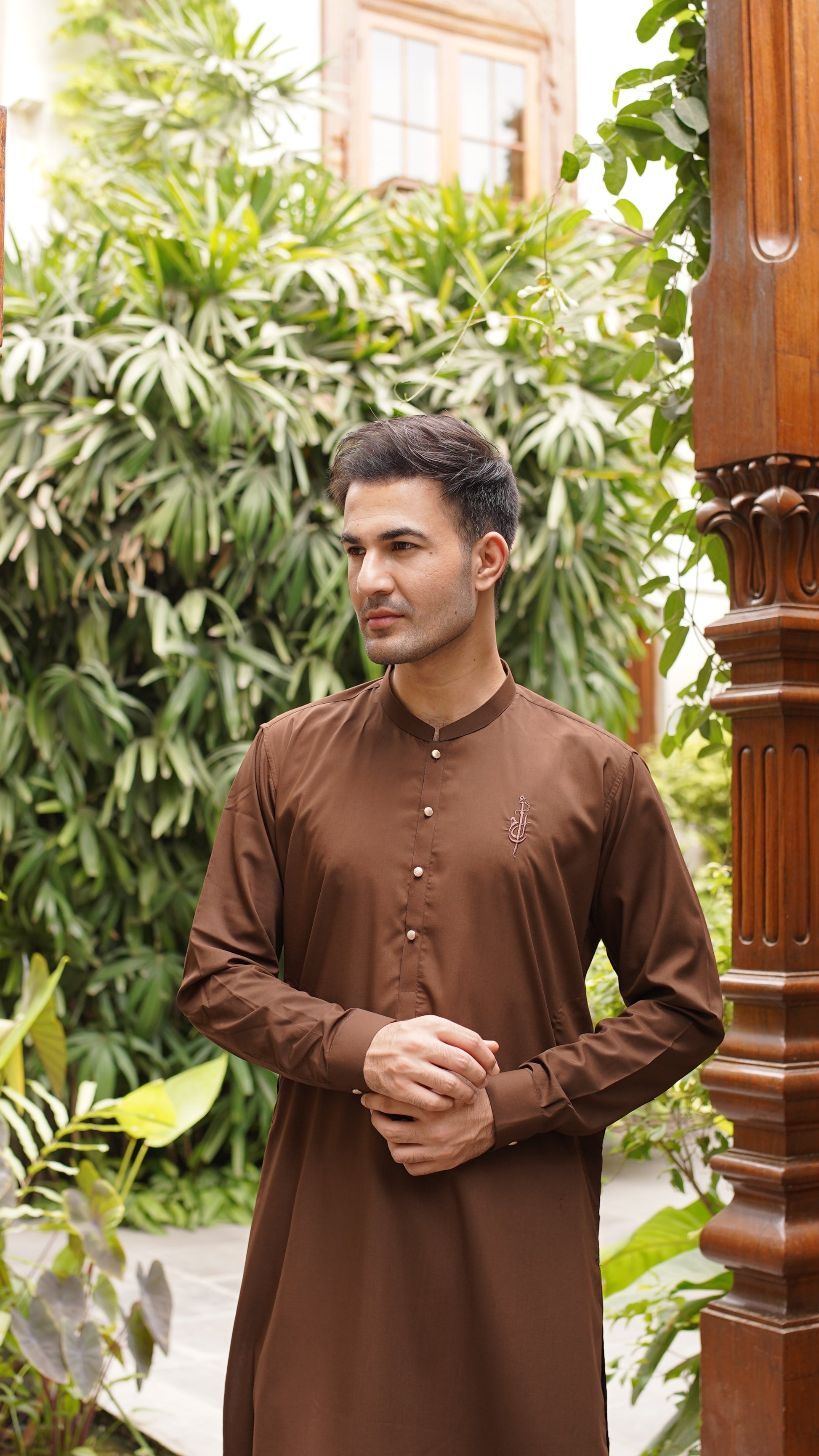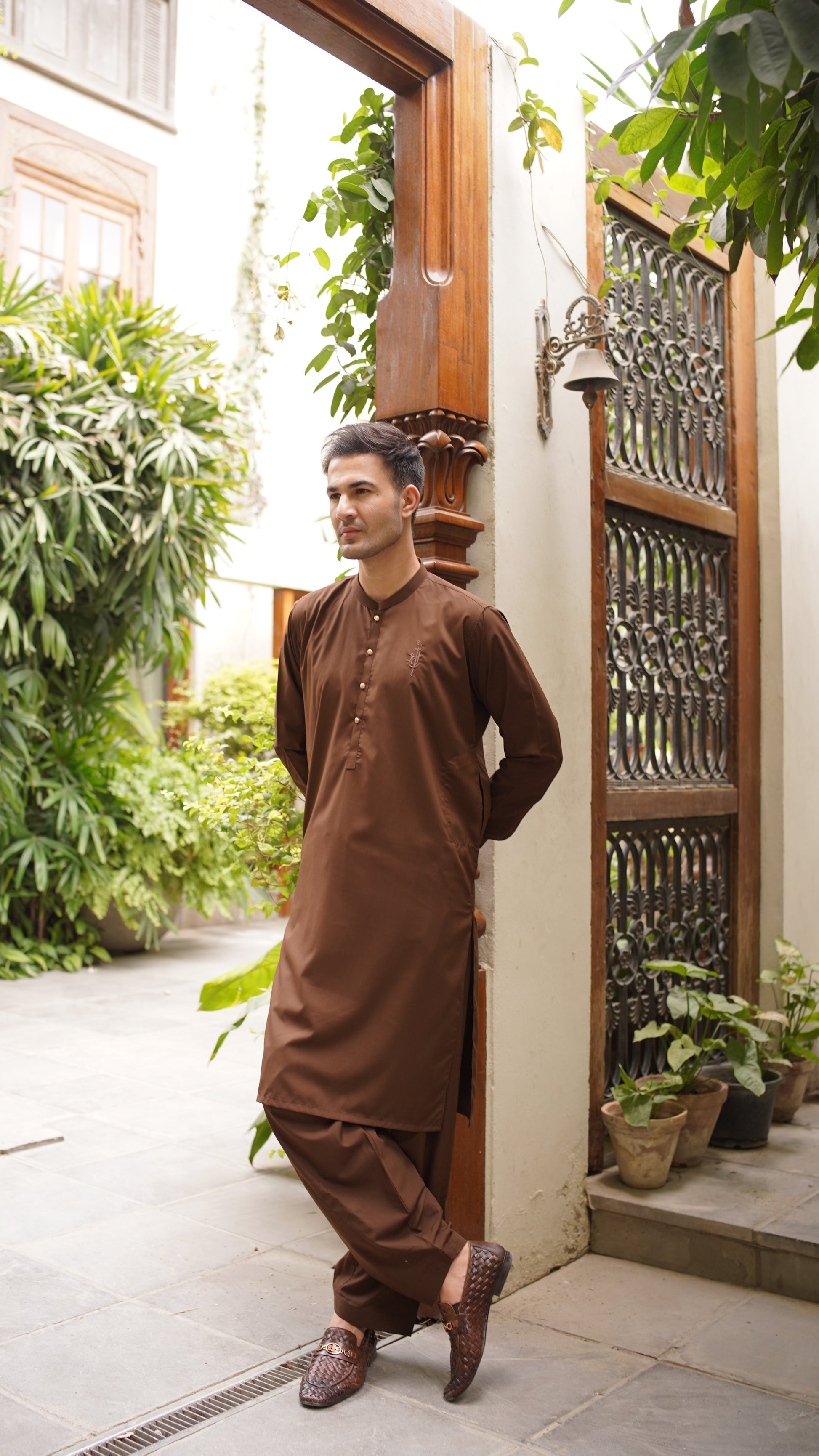 Shalwar Kameez in color: true brown. Al Ameer logo is embroidered on the left side of the chest. Embroidery color is brown.