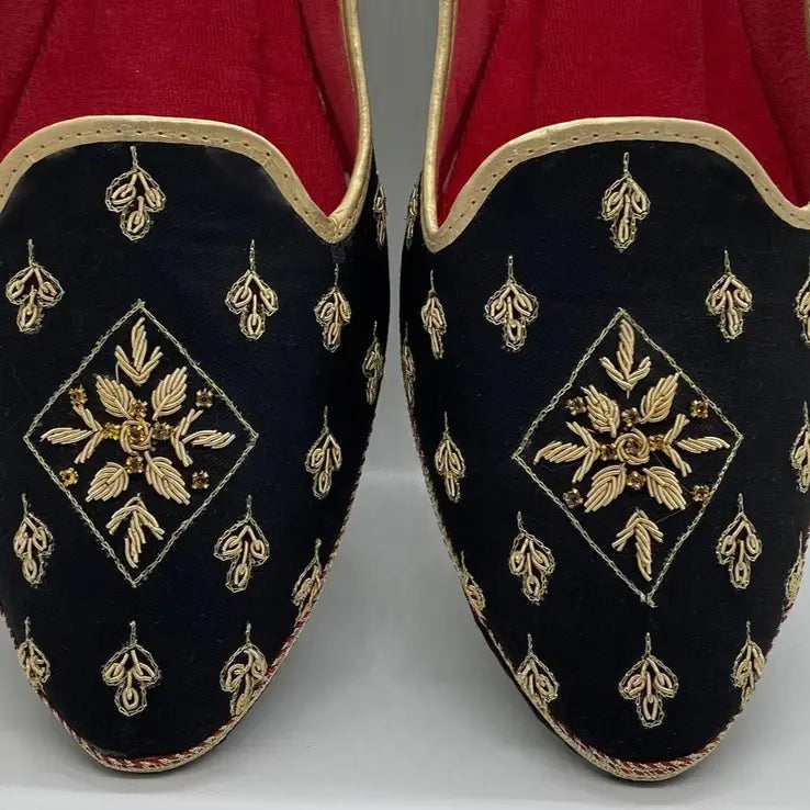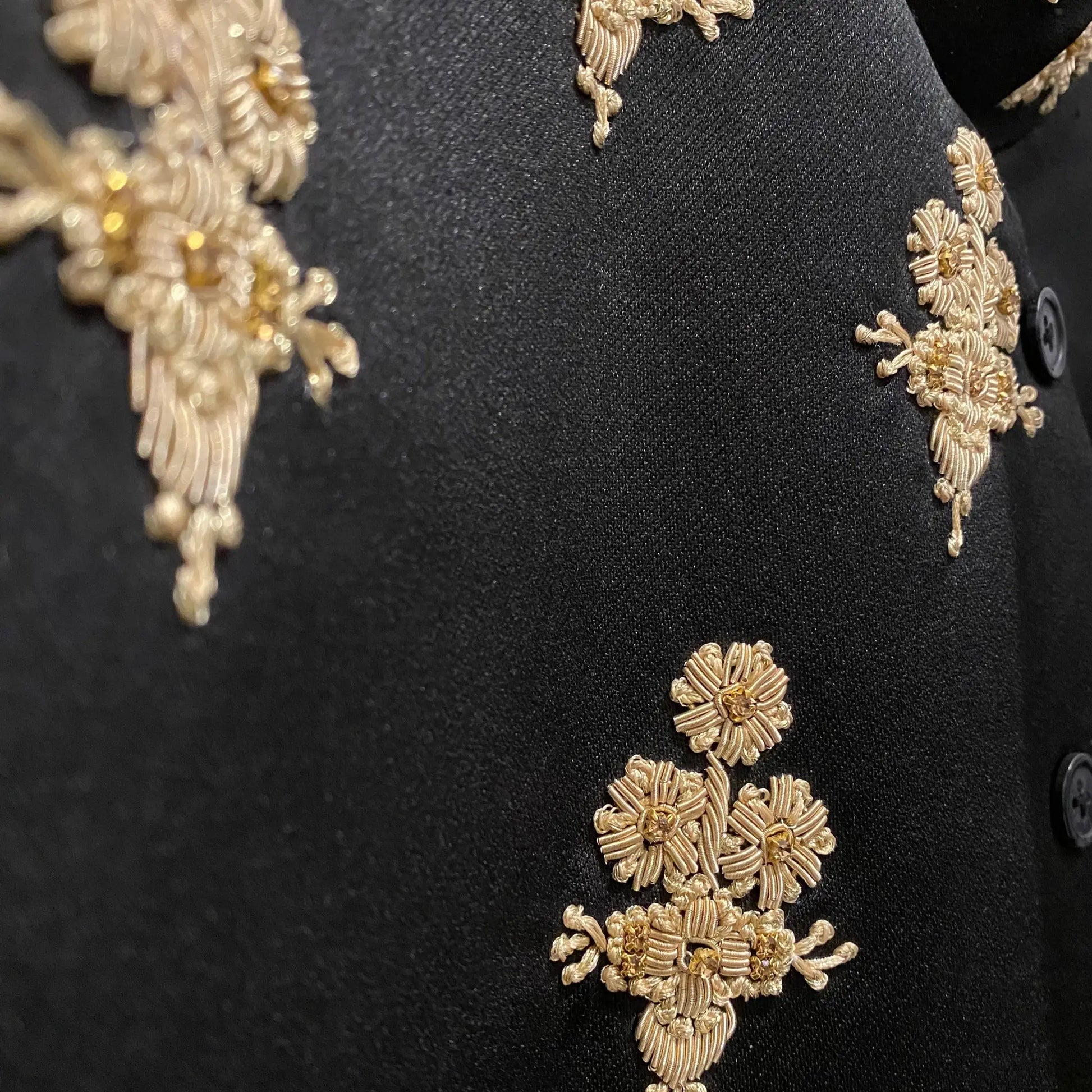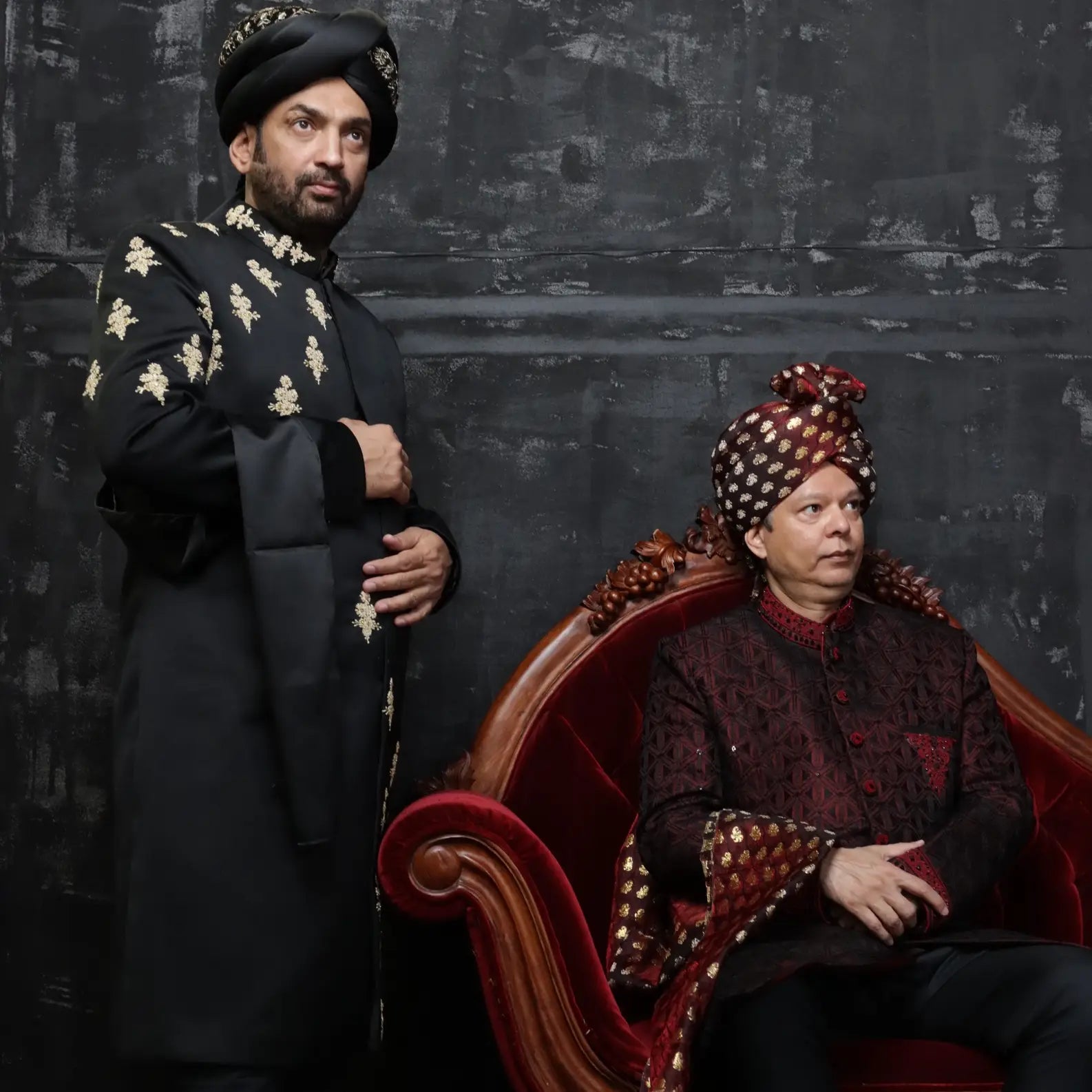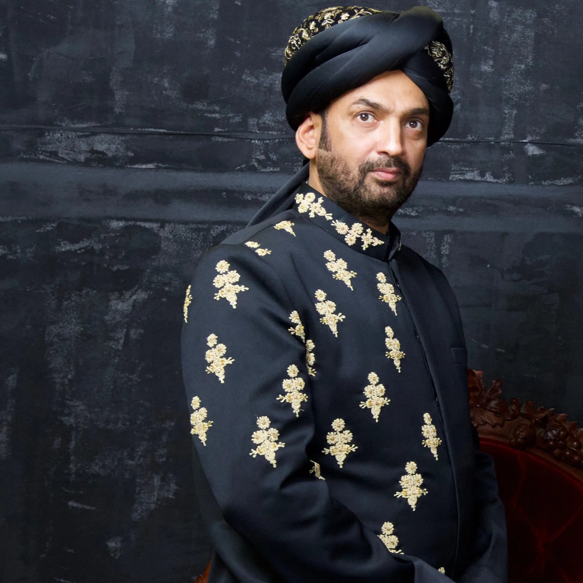 Sherwani is a long coat-like garment worn to signify Elegance and Style by the groomsmen and the groom himself. Smokey Black is designed with golden details on black base. Included with this sherwani set is a Matching Turban, Matching Khussa (Shoes), and the Al Ameer signature badge that completes the fit.